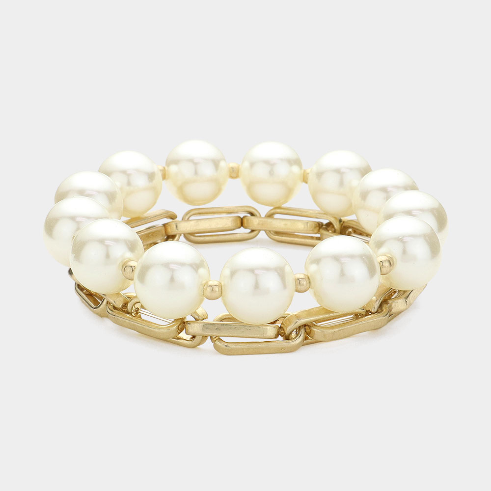 Details • Size : 0.8" H • Stretchable • Add timeless sophistication with this dual layer pearl and chain bracelet. Combining classic elegance with modern design, it features lustrous beads paired with a sleek link chain—perfect for elevating everyday style or adding a refined touch to evening wear. • Lead and Nickel Compliant