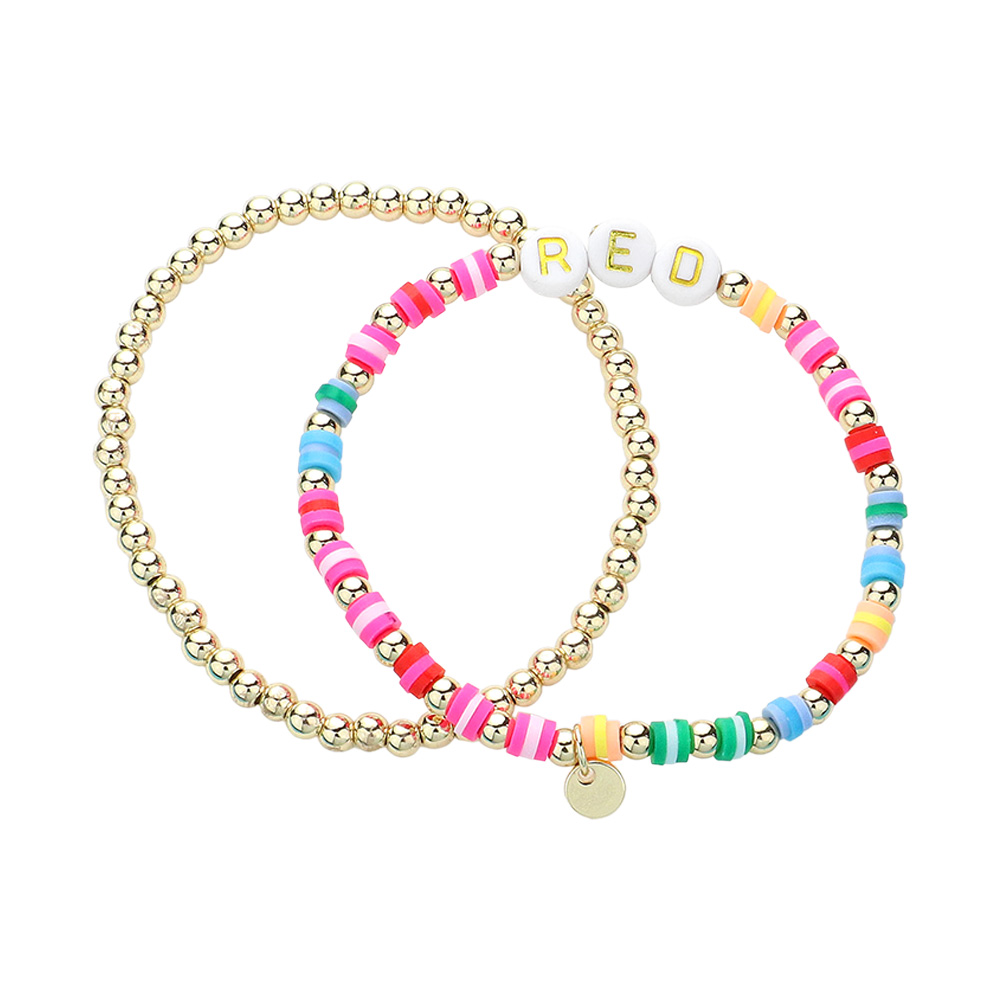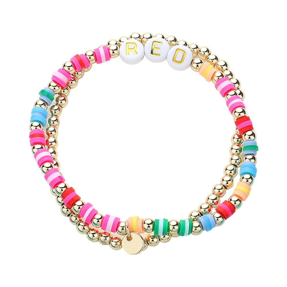 2PCS - RED Message Metal Ball Heishi Beaded Stretch Multi Layered Bracelets