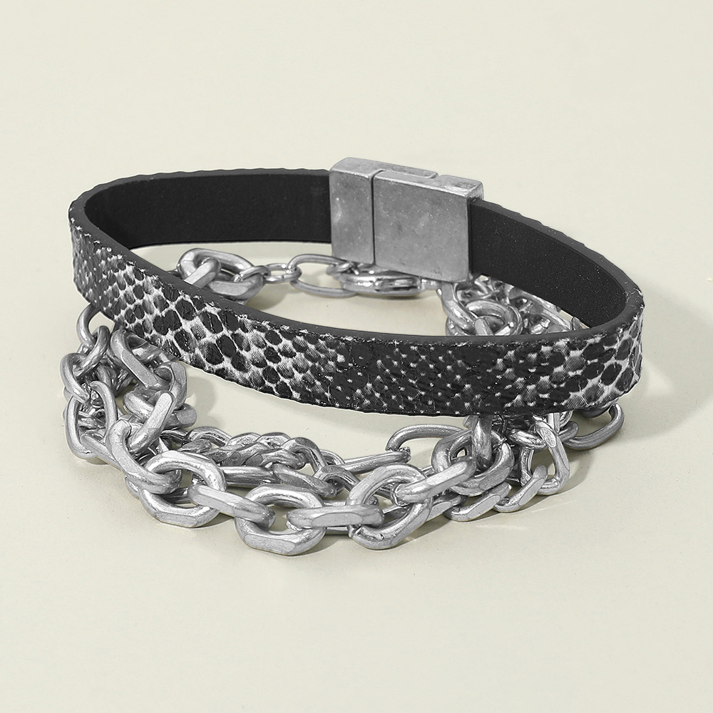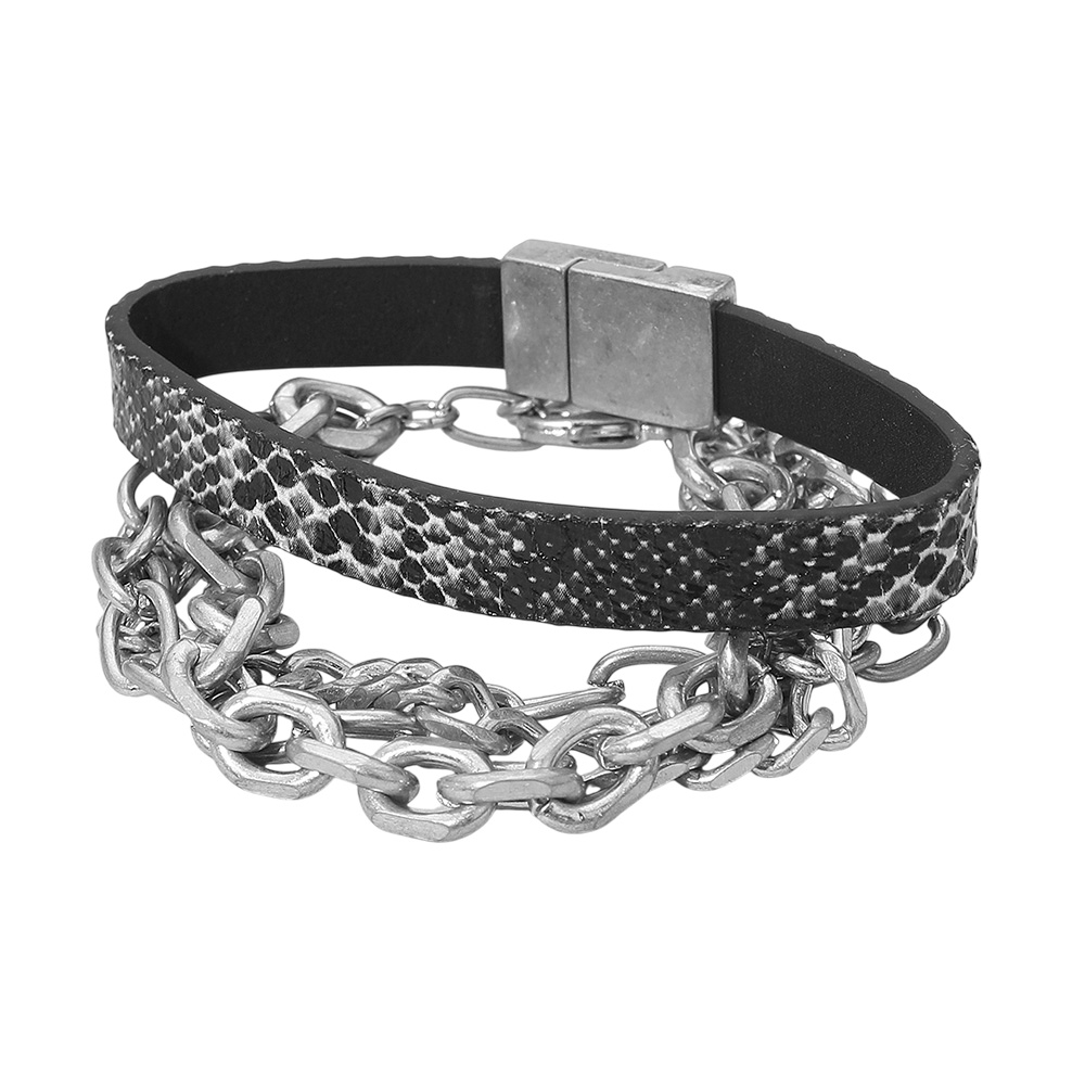 Details • Bracelet Size 1: 0.3"H, 7.5" L / Magnetic Closure • Bracelet Size 2: 0.5" H, 7" + 1.5" L / Lobster Clasp Closure • Elevate your accessories with this edgy layered bracelet featuring bold chain links paired with a sleek textured strap. Designed with a secure magnetic clasp for easy wear, it blends modern style with everyday comfort, making it a versatile piece for casual or statement looks. • Lead and Nickel Compliant