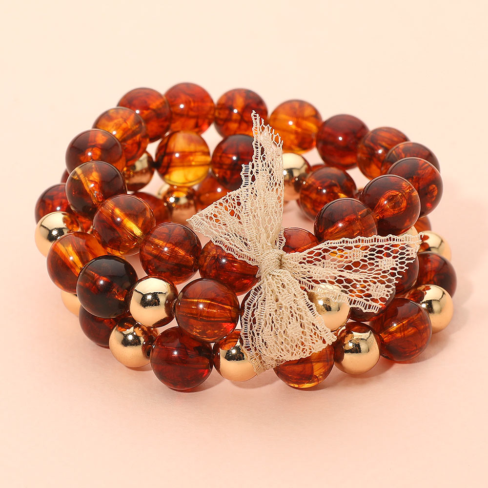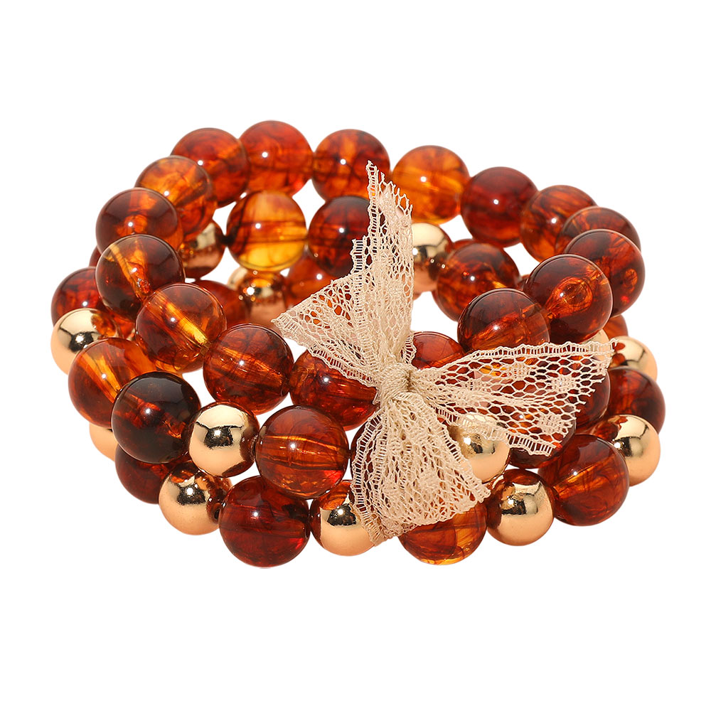 • This layered stretch bracelet set showcases glossy beads paired with radiant accents for a warm, eye-catching look. Finished with a delicate bow detail, it adds a touch of elegance and charm—perfect for enhancing everyday outfits or completing a polished ensemble.