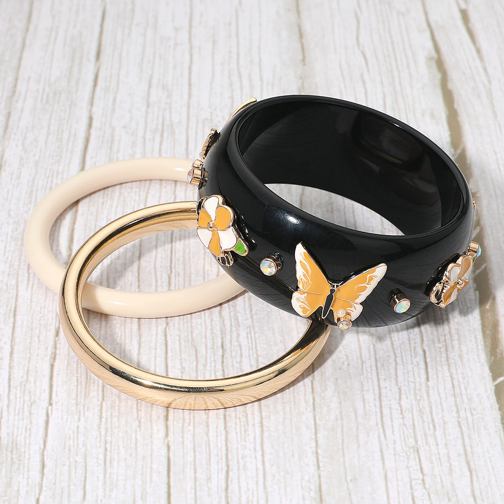 Details • Size : 2" H, 2.5" D • This charming bangle set showcases butterfly and floral accents arranged around smooth, sculpted bands for a playful yet elegant look. With its eye-catching details and dimensional design, it adds a touch of personality to both everyday outfits and dressy ensembles. • Lead and Nickel Compliant