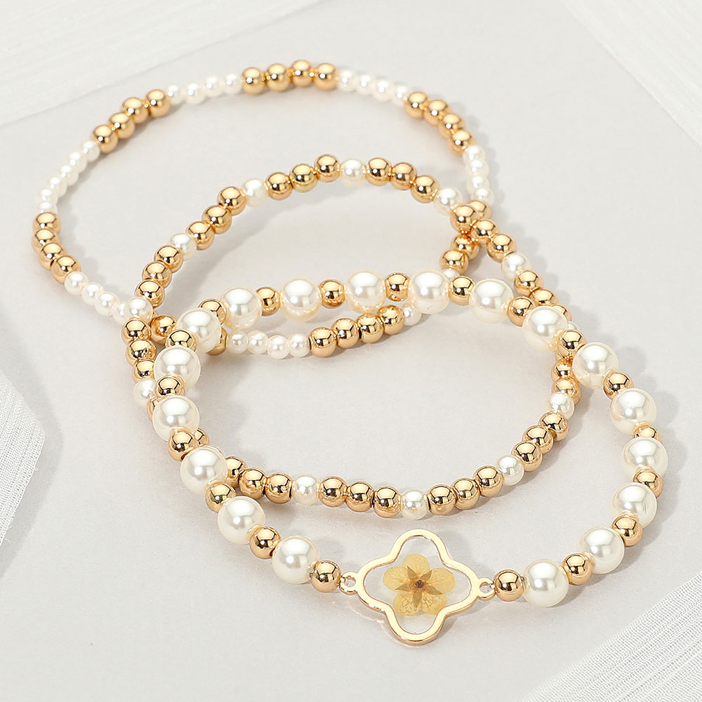 3PCS - Floral Accent Pearl Metal Ball Beaded Stretch Multi Layered Bracelets