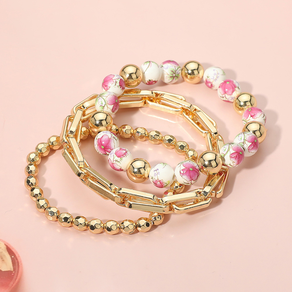 3PCS - Floral Ceramic Ball Metal Ball Beaded Stretch Multi Layered Bracelet