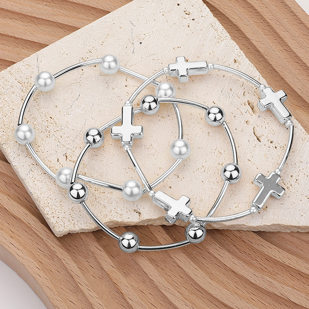 3PCS - Metal Cross Ball Pearl Station Stretch Multi Layered Bracelets