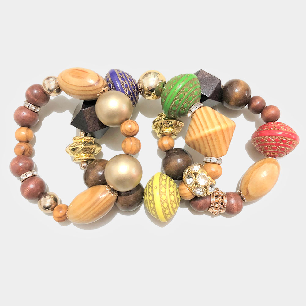 3PCS - Patterned Colorful Wood Accented Stretch Bracelets