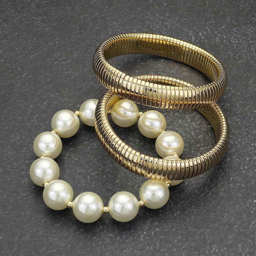• Enhance your jewelry collection with this pearl and metallic stretch bracelet set, featuring luminous pearls paired with sleek metallic bands. Designed for comfort and style, this versatile bracelet set transitions effortlessly from casual outfits to formal occasions with timeless sophistication.