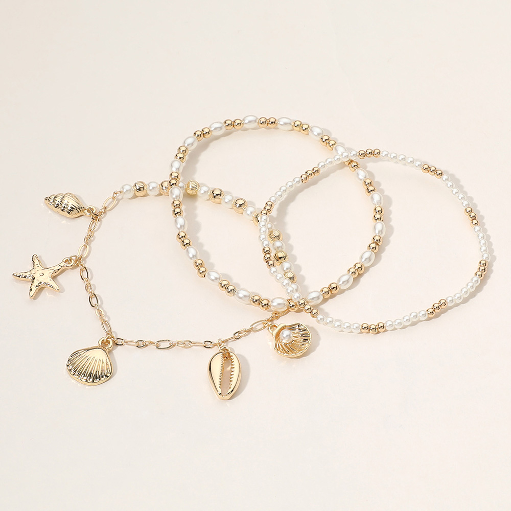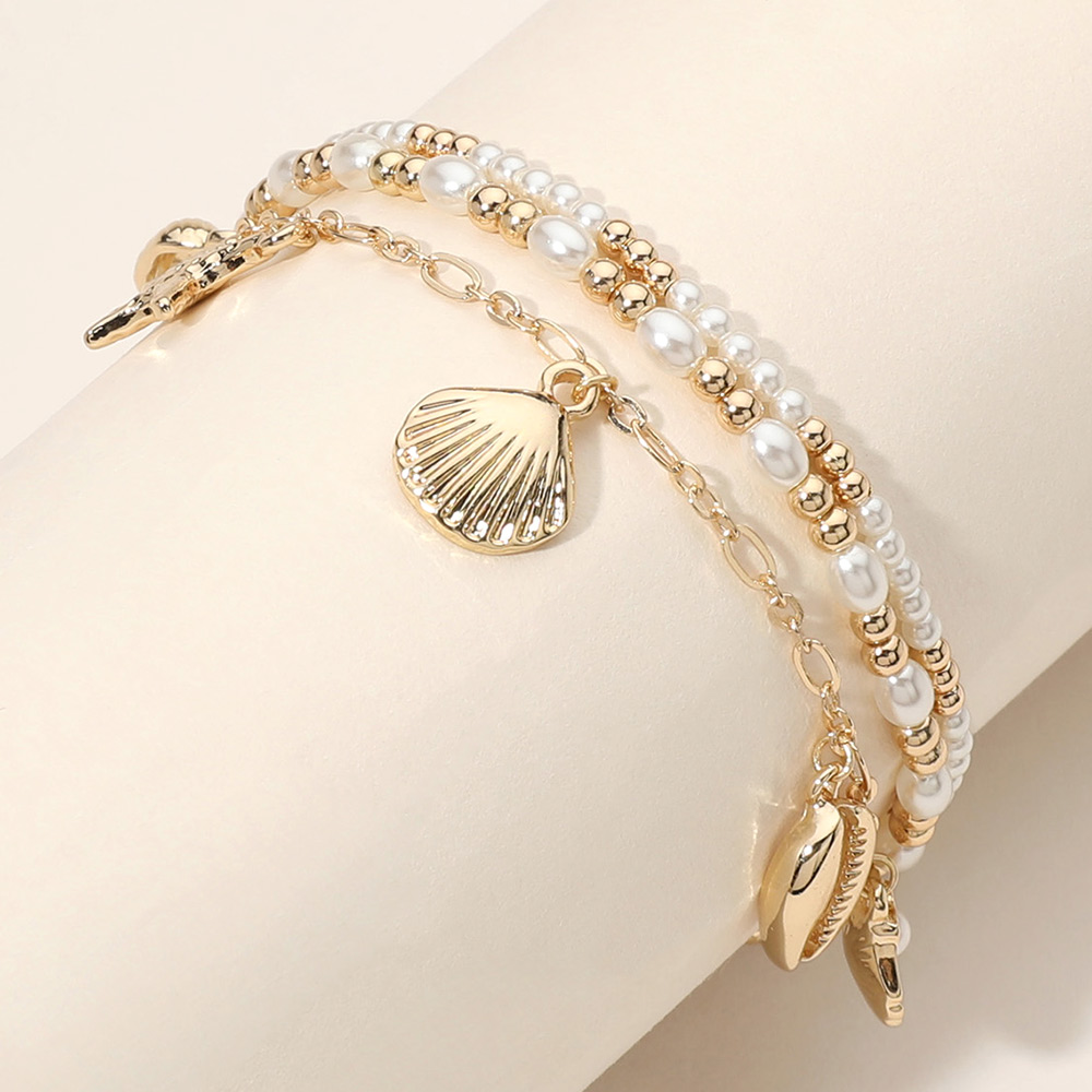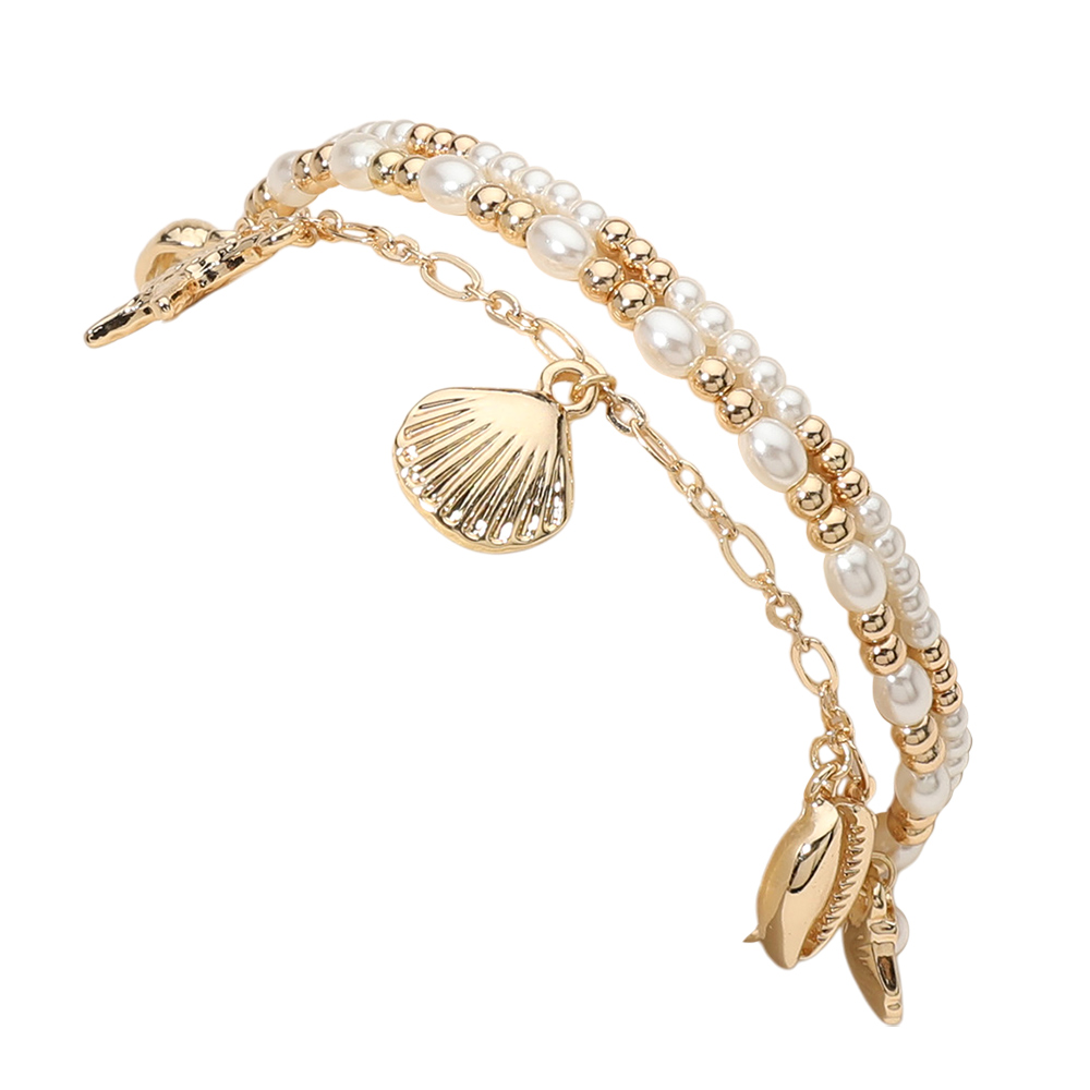 Details • Size : 0.4" H • Charm Size : 0.5" L - 0.7" L • Stretchable • Elegant layered bracelet featuring delicate beads and shell charms. Perfect for beach outings, summer events, or adding a subtle coastal touch to everyday wear, making it an ideal gift for ocean lovers. • Lead and Nickel Compliant