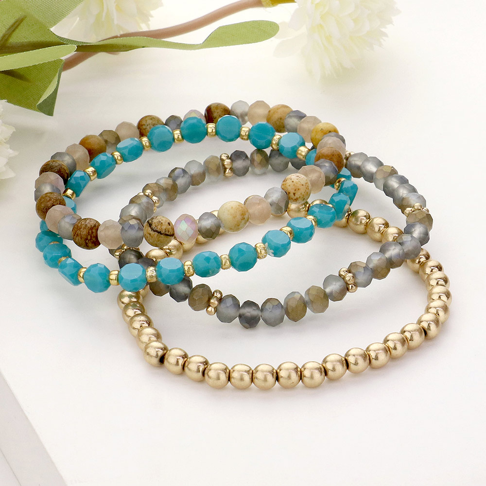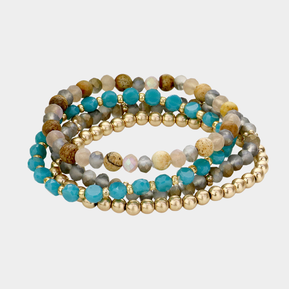 Details • Size : 0.8" H • Stretchable • This four-piece bracelet set blends polished metallics with matte and faceted beads in a soothing mix of natural tones. Designed for layering or solo wear, these stretch bracelets bring an effortless, earthy elegance to any casual or bohemian-inspired look. • Lead and Nickel Compliant