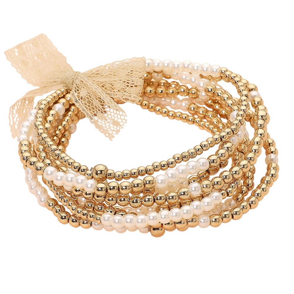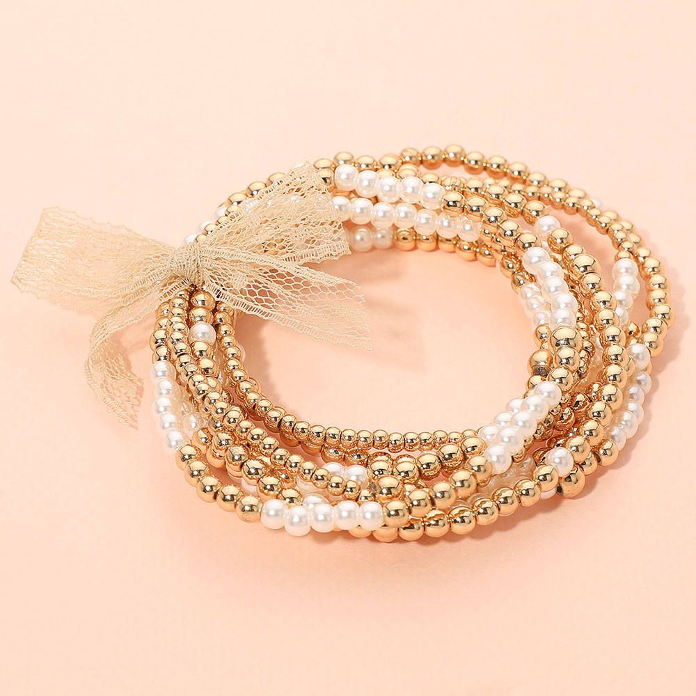 Details • Size : 1.25" H • Stretchable • This multi-layer pearl bead bracelet set adds a graceful touch to any look. Designed with stacked beading and a delicate bow accent, it brings timeless charm and refined style, making it a beautiful accessory for both everyday wear and special occasions. • Lead and Nickel Compliant