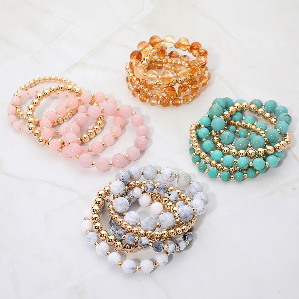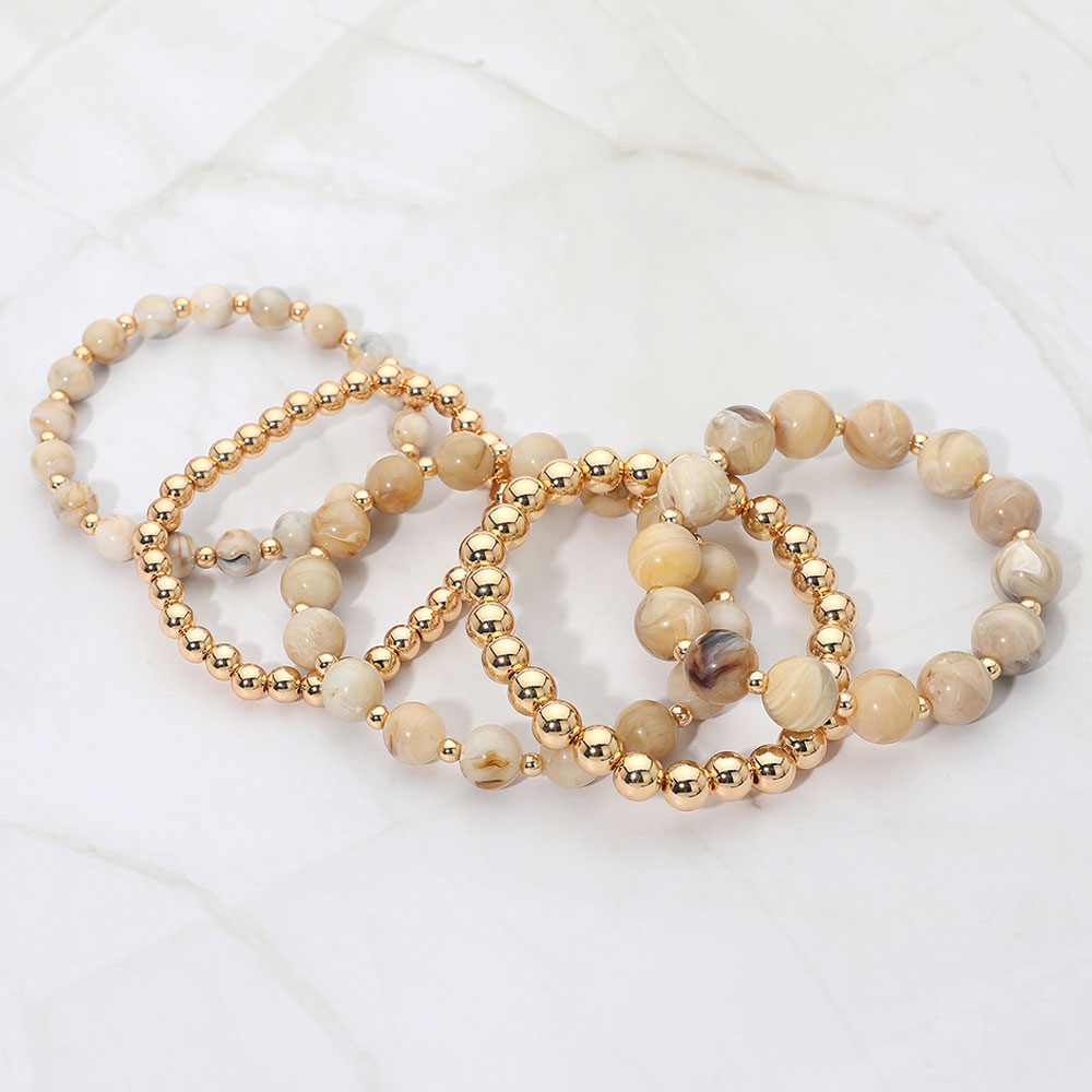 • This multi-layer beaded stretch bracelet set features a mix of polished spheres and translucent marbled accents, offering a rich, dimensional look. Flexible and easy to wear, it adds an eye-catching stacked style that enhances both casual and elevated outfits with warm, radiant detail.