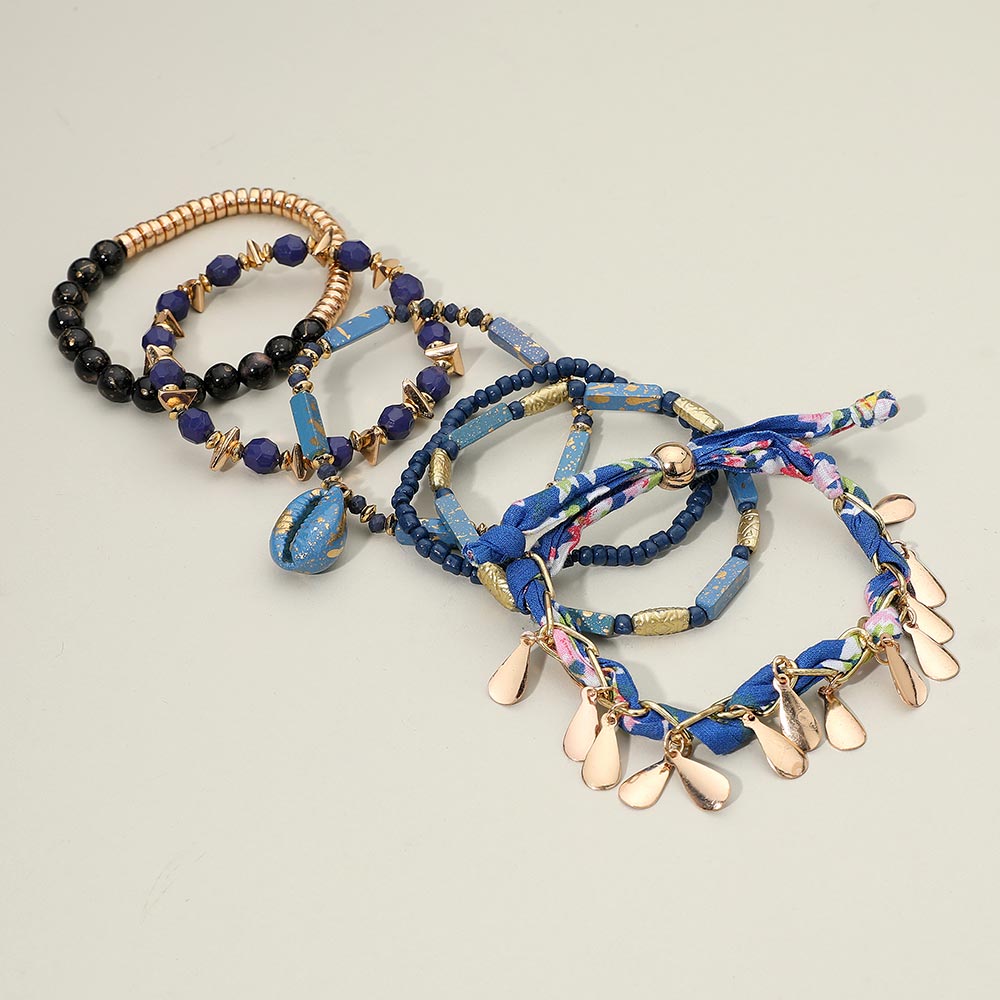 Details • Size 1 : 1.25" H / Stretchable • Size 2 : 1" H / Adjustable • Create a beach-inspired look with this layered boho bracelet set featuring mixed blue beads, floral fabric ties, gold-tone teardrop charms, and a standout seashell accent. Each bracelet offers unique textures and coastal flair that can be worn together as a bold stack or individually for a more subtle style. Perfect for vacation outfits, summer festivals, and everyday statement accessorizing. • Lead and Nickel Compliant • Made In India