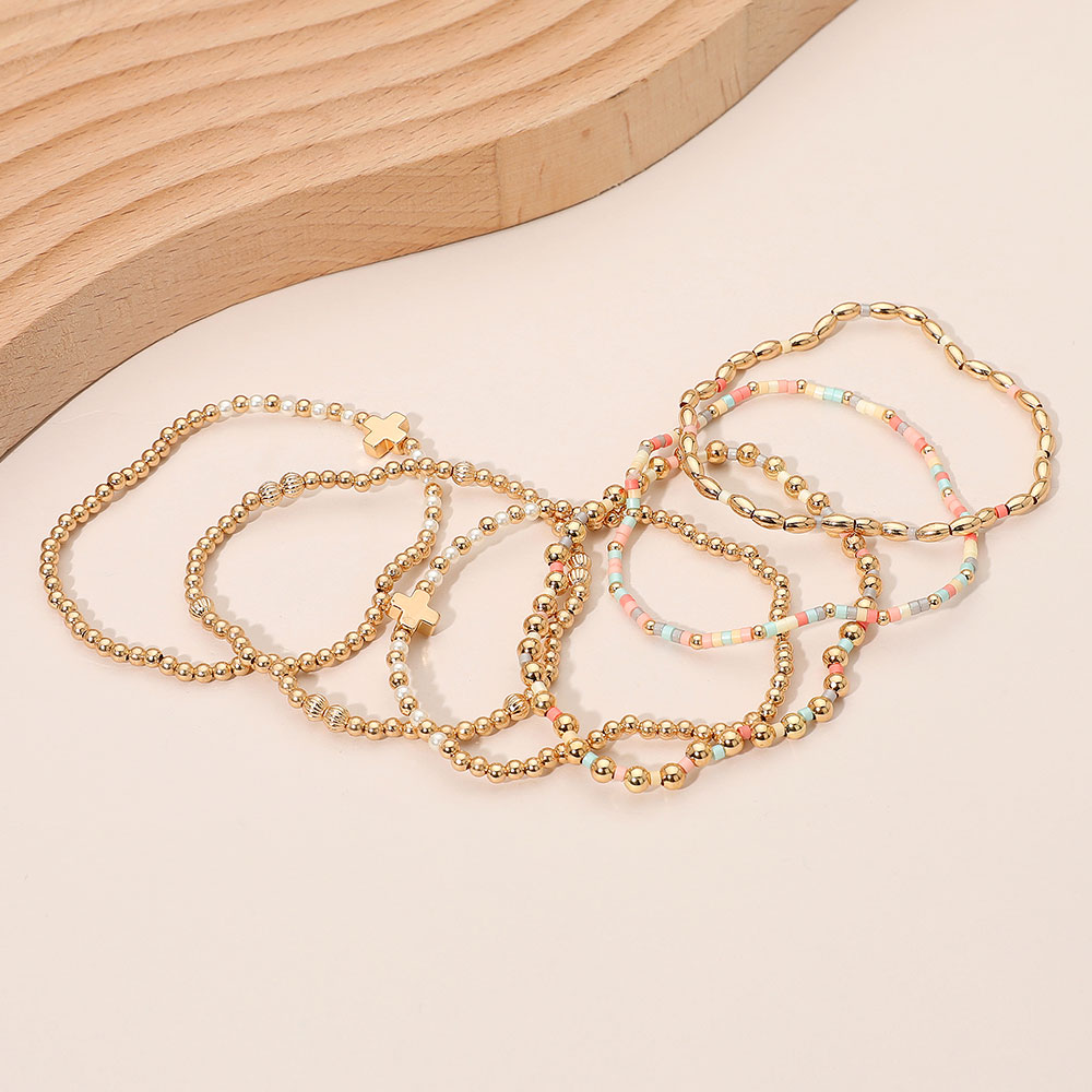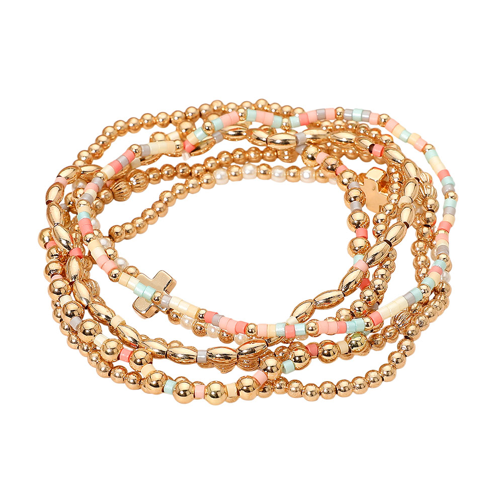 6PCS - Cross Charm Accent Seed Beaded Stretch Multi Layered Bracelets