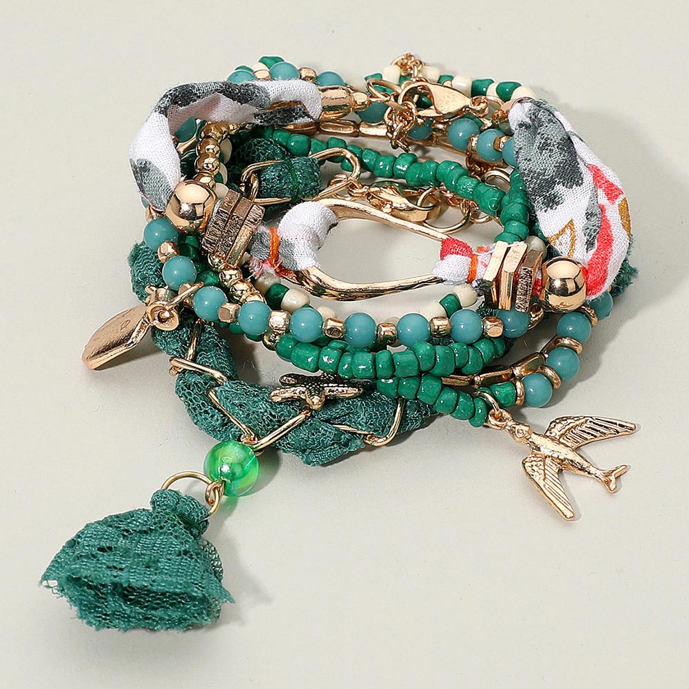 Details • Size 1 : 1" H / Stretchable • Size 2 : 1" H, 7" + 2" L / Lobster Clasp Closure • Boho bird fabric tassel starfish charm bracelet set featuring layered beaded strands, fabric-wrapped details, tassel styling, and mixed symbolic charms like a bird and starfish for a playful nature-inspired accessory look. Designed for stacking and everyday wear, adding unique artisan flair to casual outfits and gifting occasions. • Lead and Nickel Compliant • Made In India