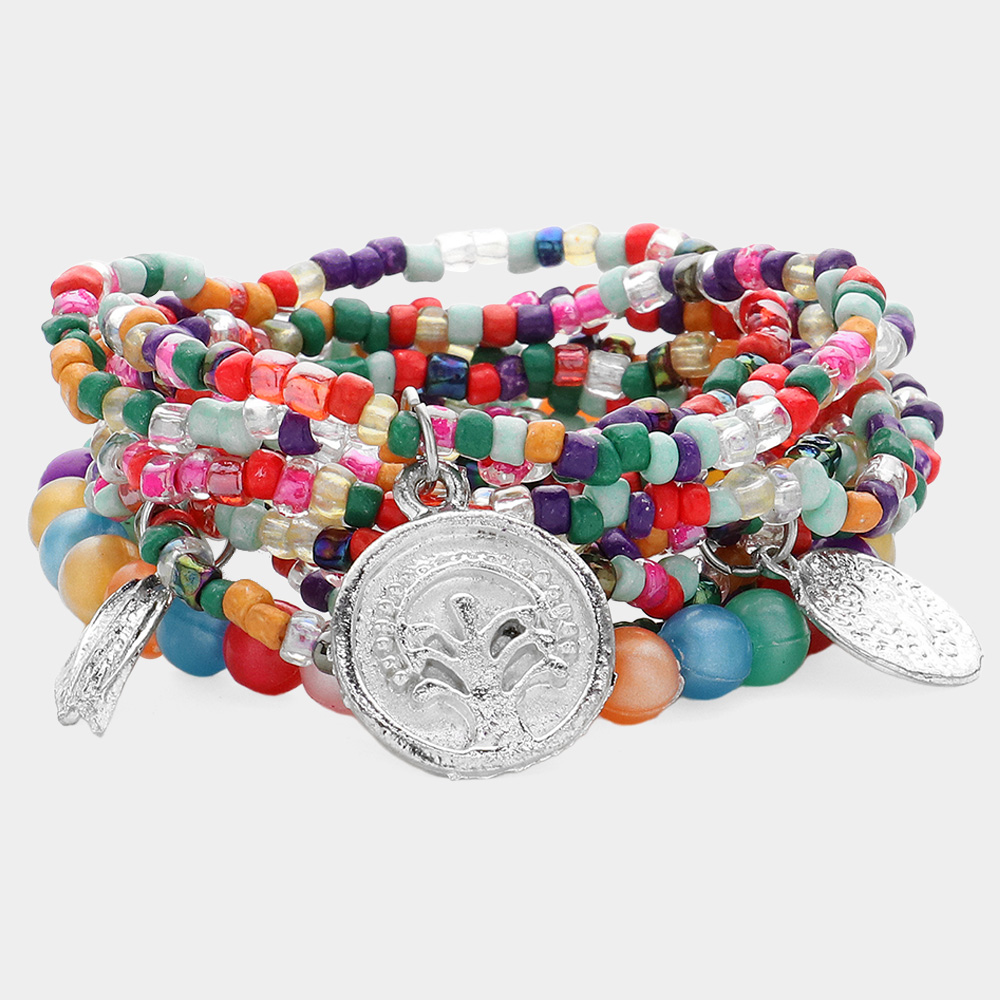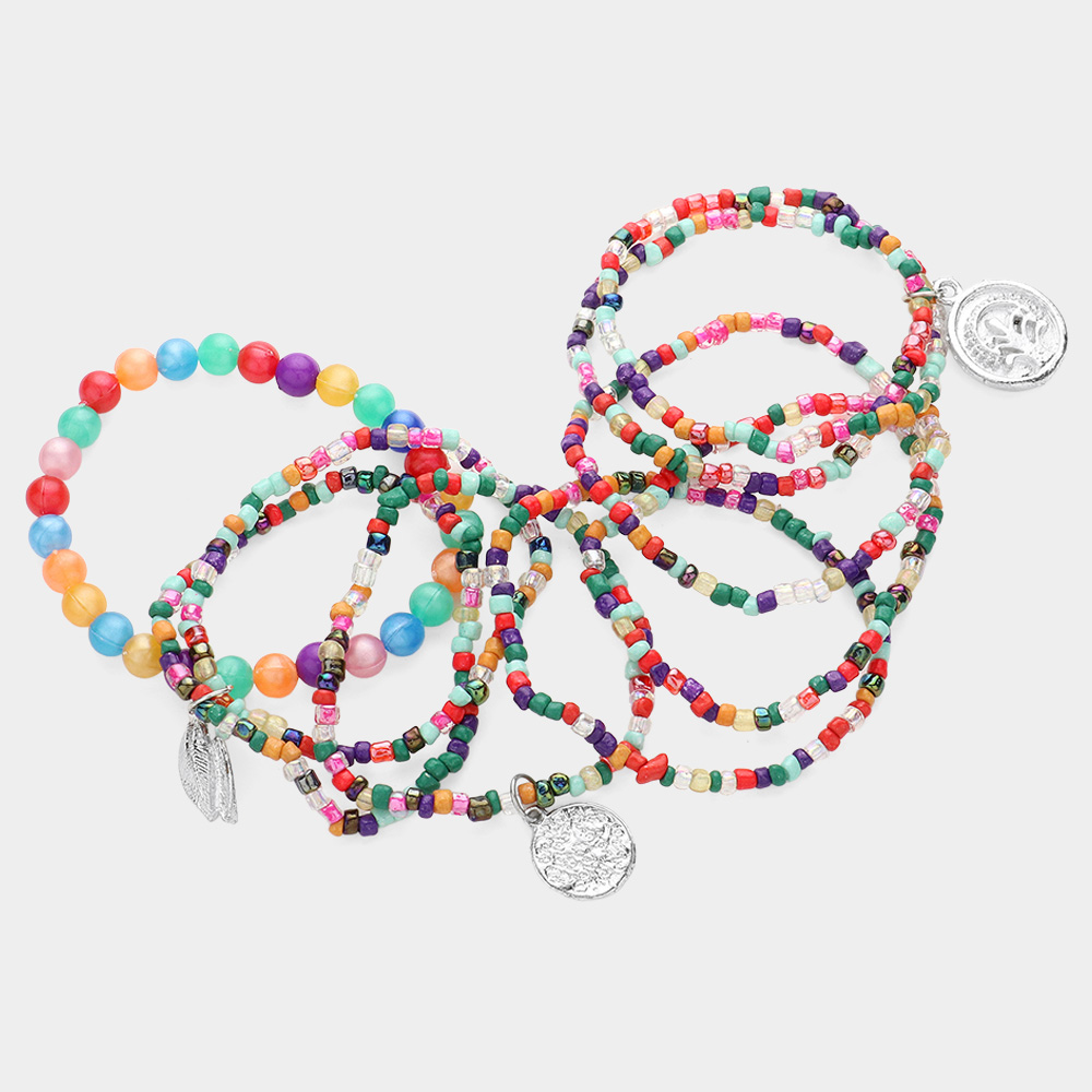 7PCS - Various Beads Beaded Metal Leaf Tree Of Life Charm Pointed Stretch Multi Layered Bracelets