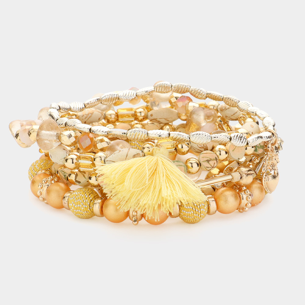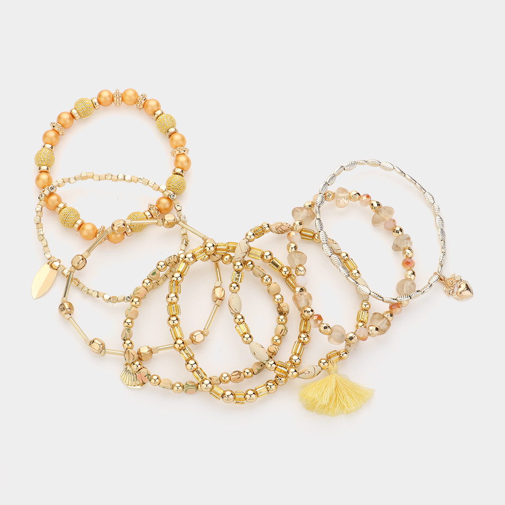 8PCS - Metal Shell Heart Tassel Charm Multi Beads Beaded Layered Bracelets