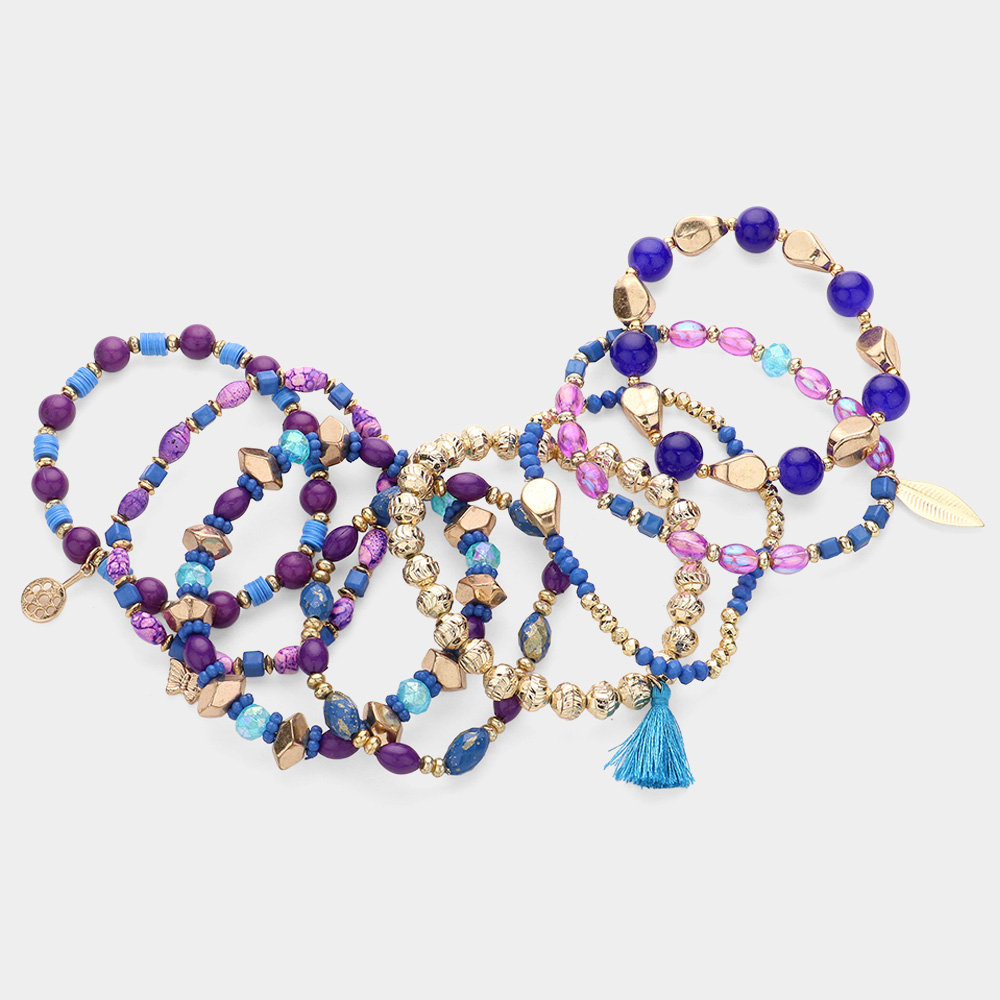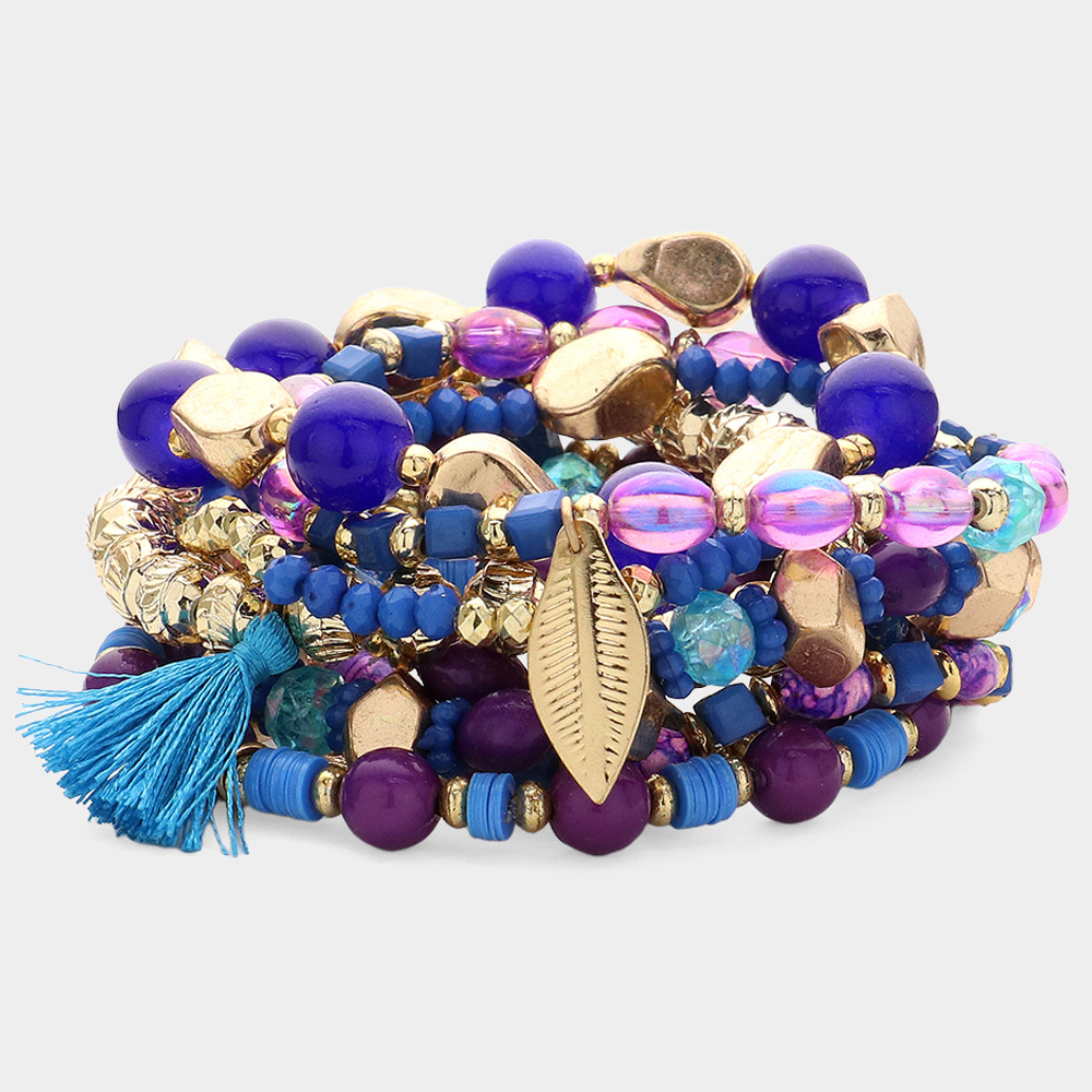 8PCS - Various Beads Beaded Tassel Metal Leaf Charm Pointed Stretch Multi Layered Bracelets