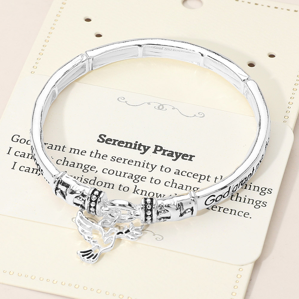 Details • Size : 0.25" H, 2.4" D • Charm Size : 0.6" L • Stretchable • Embrace peace and faith with this elegant bangle bracelet featuring the Serenity Prayer and a symbolic dove charm. Designed to inspire calm and courage, it serves as a daily reminder of wisdom and inner strength, making it a meaningful gift or personal keepsake for spiritual reflection. • Lead and Nickel Compliant