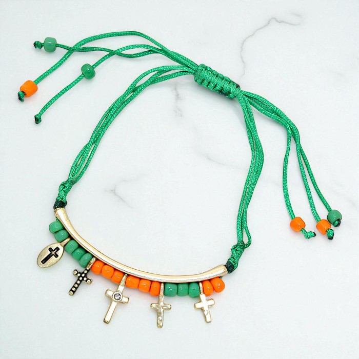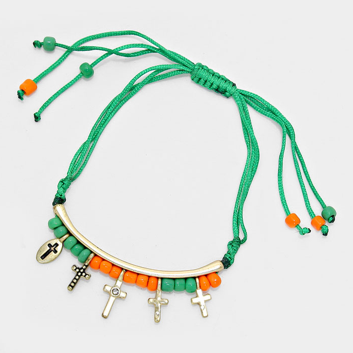 Stone Paved Cross Charm Beaded Thread Adjustable Cinch Pull Tie Bracelet