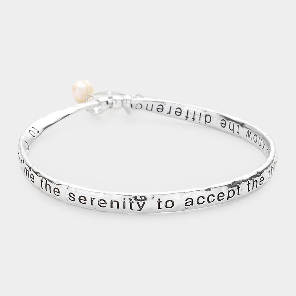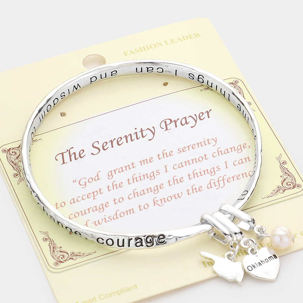Details • Size : 1.1" H, 2.5" D • This inspirational bangle bracelet features the Serenity Prayer and meaningful charm accents that offer daily encouragement. Designed to remind the wearer of strength, hope, and clarity, it makes a heartfelt gift or a personal keepsake that brings comfort and motivation throughout the day. • Lead and Nickel Compliant