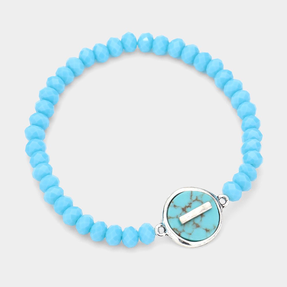 -T- Initial Monogram Turquoise Charm Faceted Beaded Stretch Bracelet