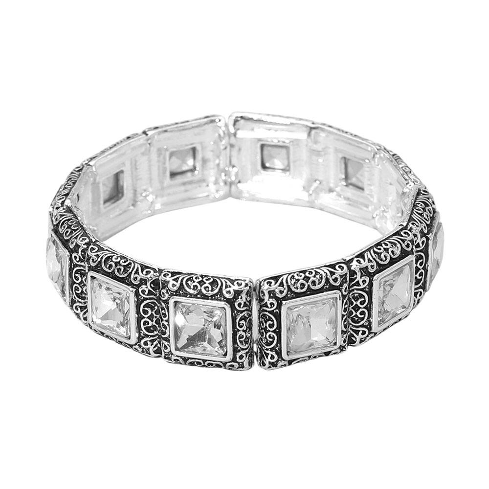 Antique Metal Scrollwork Frame Square Tile Beaded Stretch Bracelet