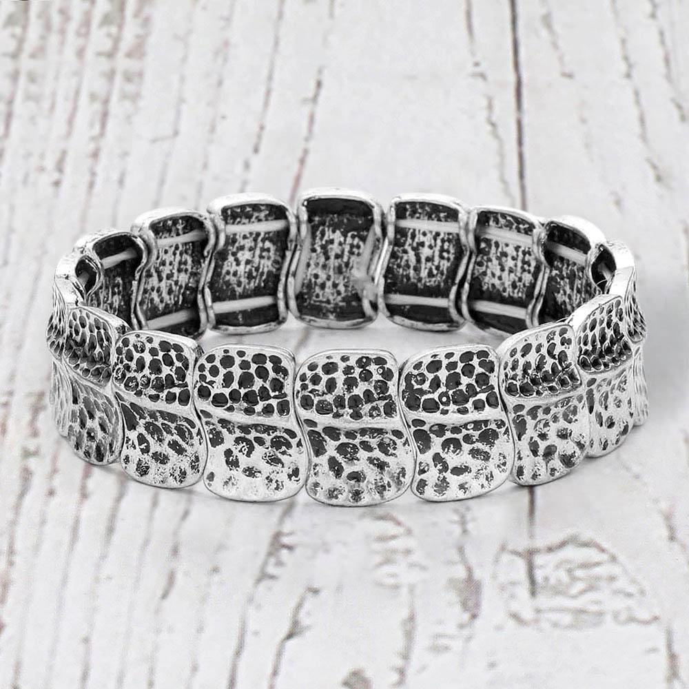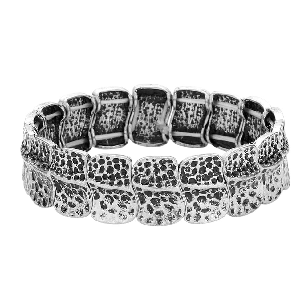 Details • Size : 0.6" H • Stretchable • Bold stretch bracelet featuring hammered-style links arranged in a sleek band design, adding a modern and artistic touch to any accessory collection. Ideal for everyday wear or stacking with other pieces for a layered, statement look. • Lead and Nickel Compliant