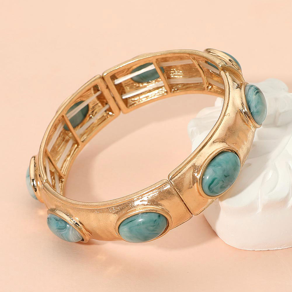 • This textured stretch bracelet is adorned with oval cabochon-style accents, giving it a bold and artistic appeal. Designed for comfort and easy wear, it’s a versatile piece that adds a touch of statement style to both casual and dressy outfits.