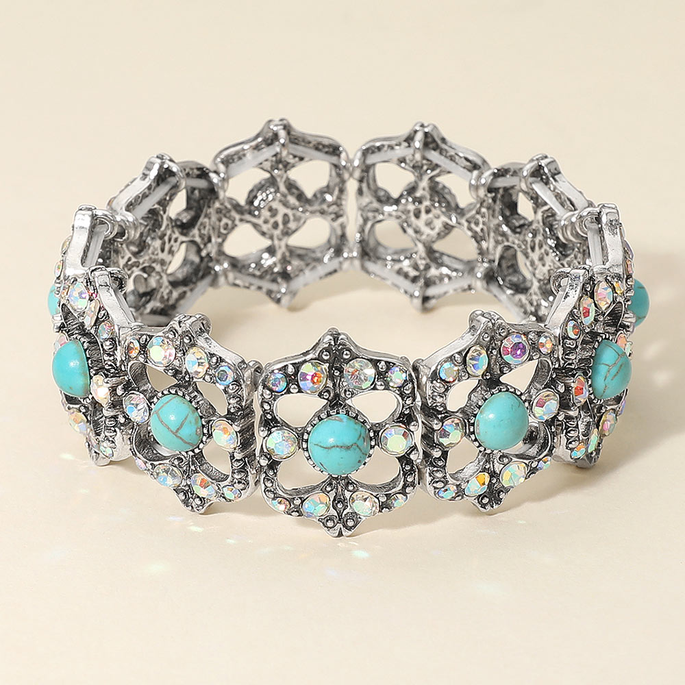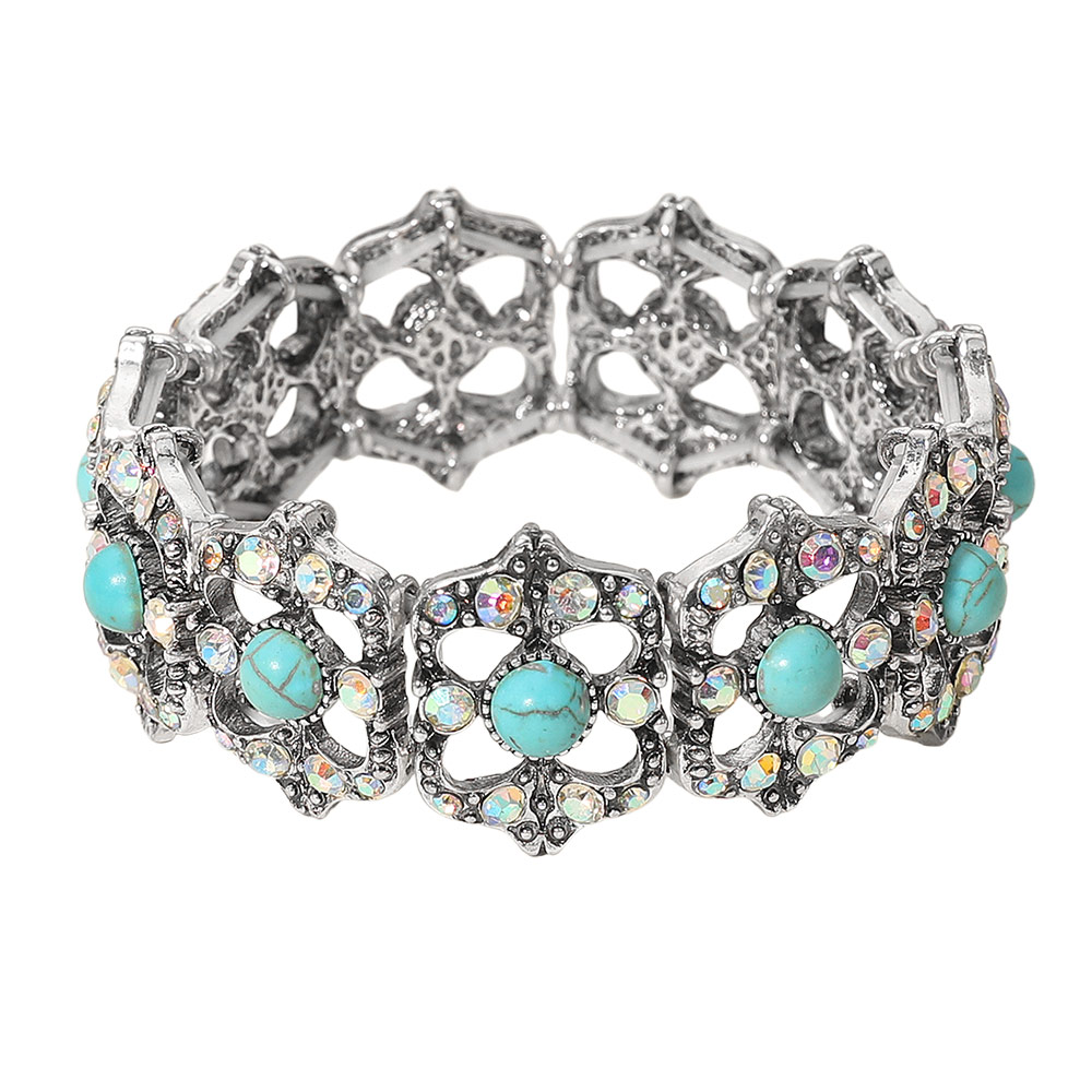 Details • Size : 1" H • Stretchable • This vintage-inspired stretch bracelet features ornate linked panels accented with radiant gemstones for an eye-catching, elegant finish. Its intricate detailing adds a touch of timeless charm, making it a standout accessory for special occasions or everyday style with a refined twist. • Lead and Nickel Compliant