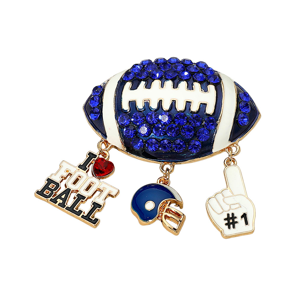 • Sporty football brooch featuring rhinestone football design with dangling charms including helmet, #1 foam finger, and “I Love Football.” Perfect accessory for gameday outfits, tailgates, or fan gear.