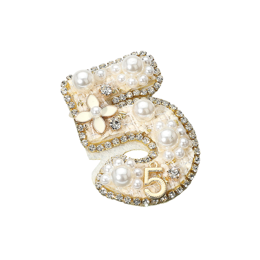 Details • Size : 1.6" X 2.1" • Pin Brooch • Chic brooch featuring a bold number 5 design adorned with lustrous beads, rhinestones, and floral accents. Adds a touch of luxury and sparkle to jackets, scarves, or bags. A perfect statement accessory that blends timeless charm with modern sophistication. • Lead and Nickel Compliant