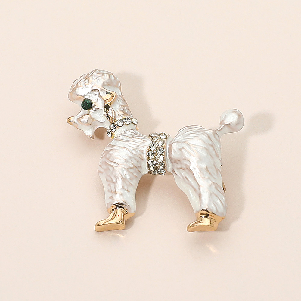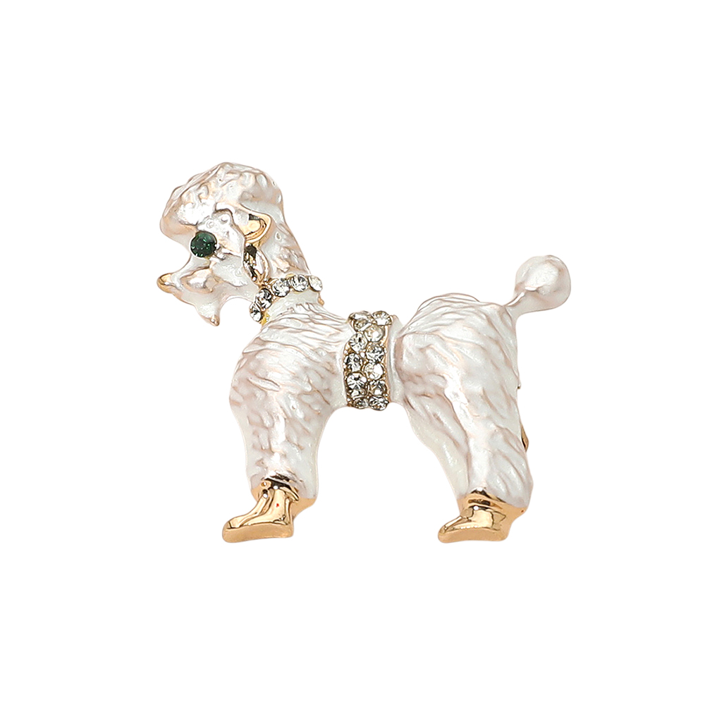 Details • Size : 1.3" X 1.4" • Pin Brooch • Charming poodle brooch adorned with sparkling crystal collar and waist accents, detailed enamel finish, and gold-toned highlights. A delightful accessory for dog lovers, this brooch adds sophistication to jackets, scarves, or handbags while showcasing a love for pets and elegant fashion flair. • Gold Dipped • Lead and Nickel Compliant