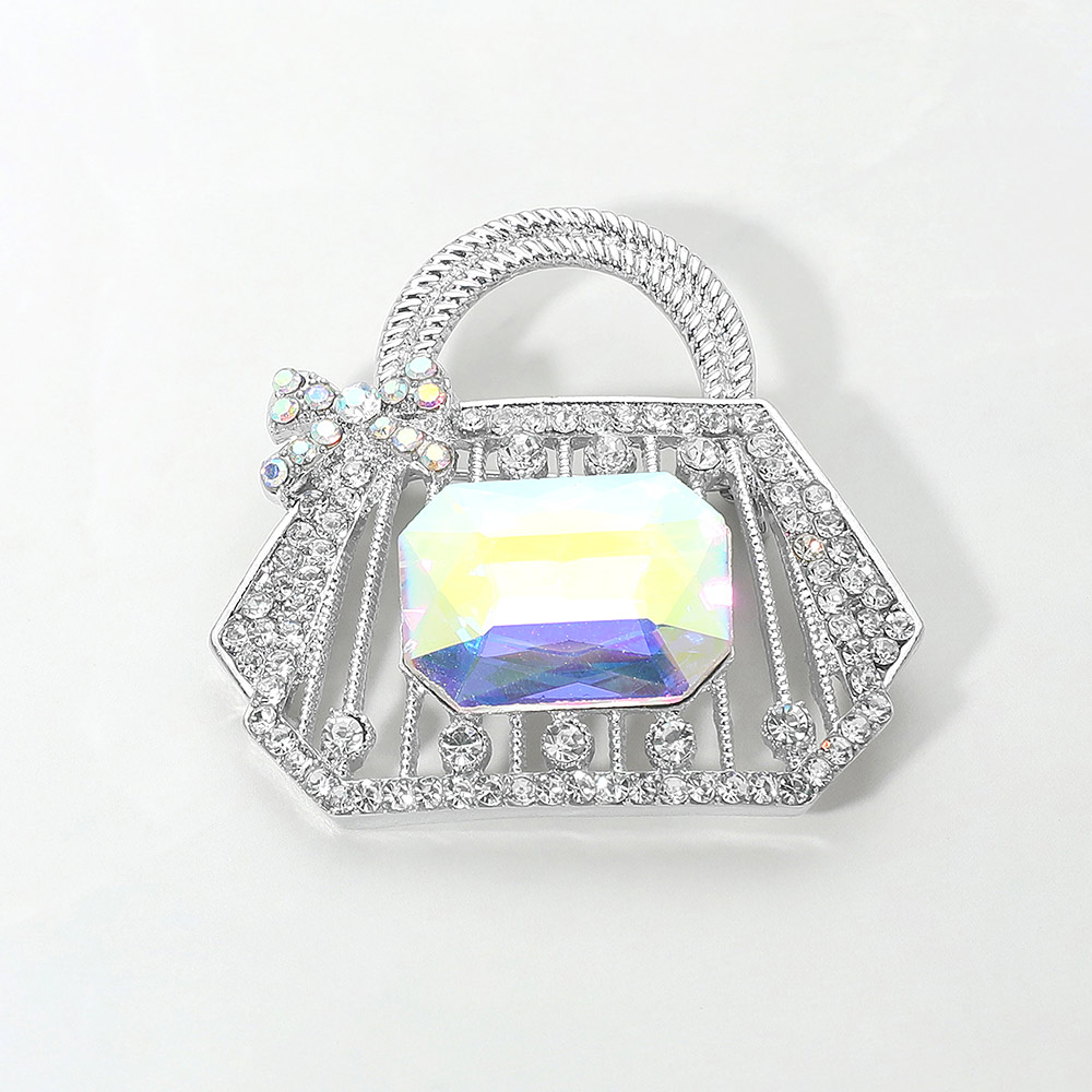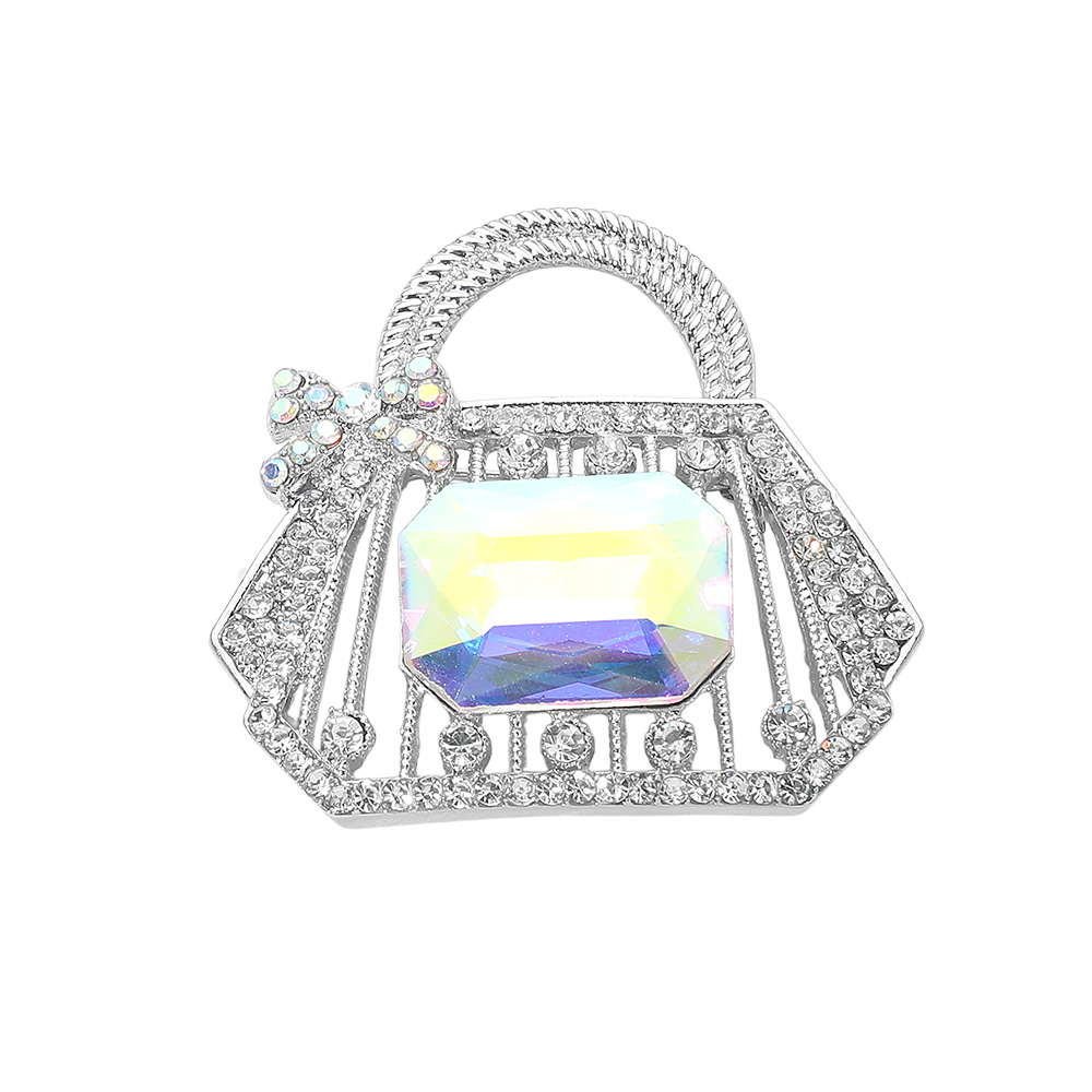 Details • Size : 2.1" X 2" • Pin Brooch • Elevate your style with this handbag-shaped brooch, featuring a large faceted crystal centerpiece, bow detail, and shimmering stones. A chic accessory for fashion lovers, it adds sparkle and charm to outfits for everyday or special occasions. • Lead and Nickel Compliant