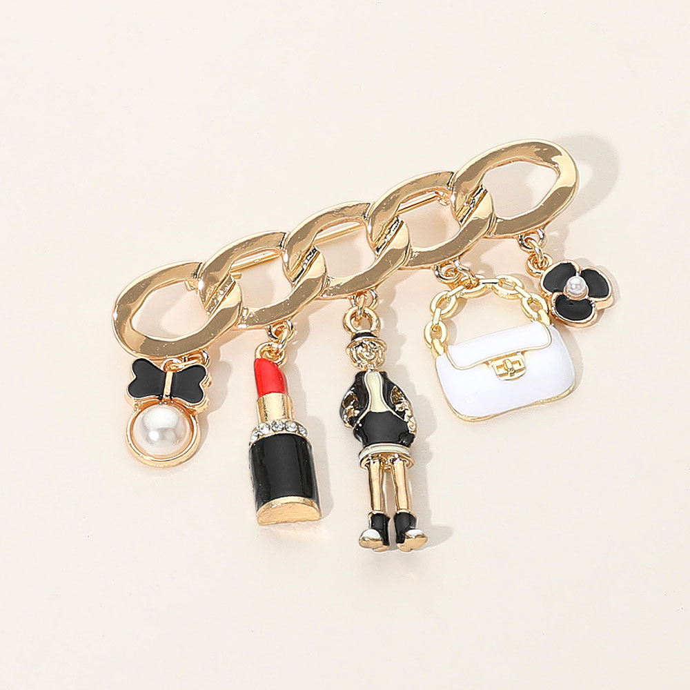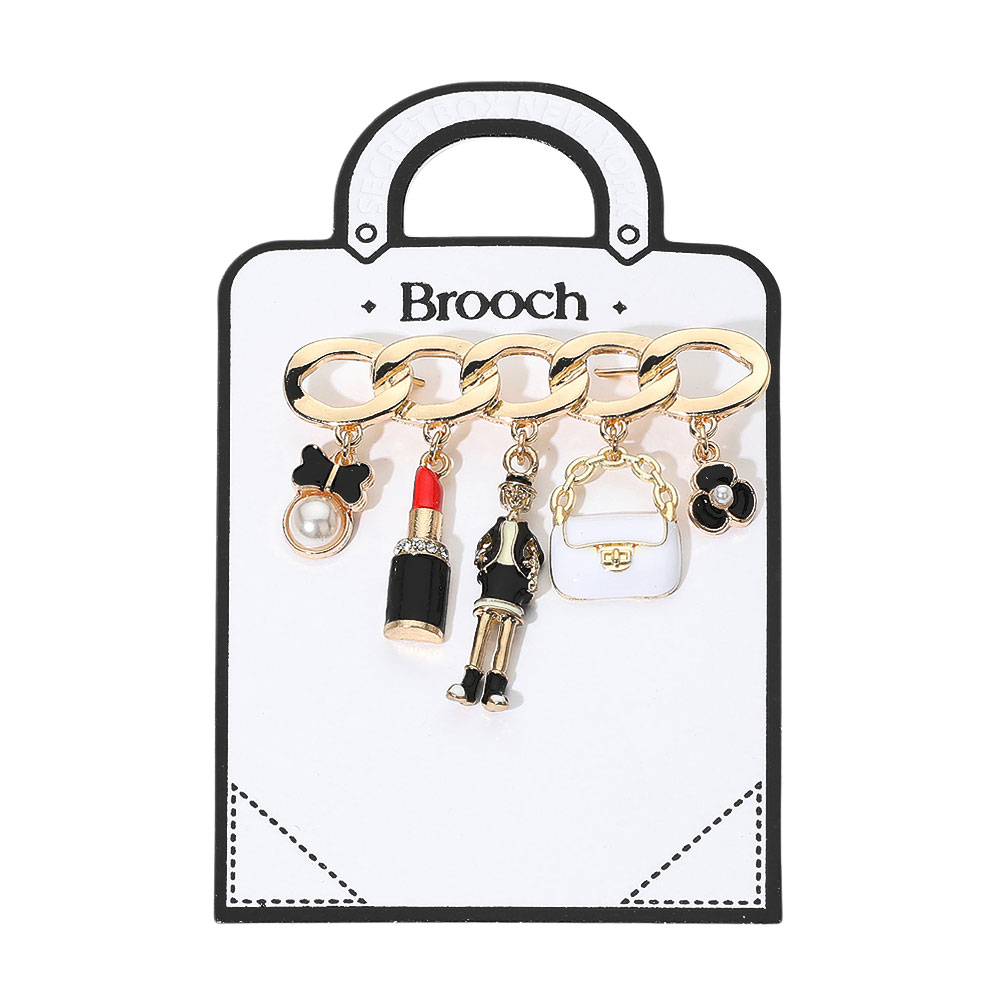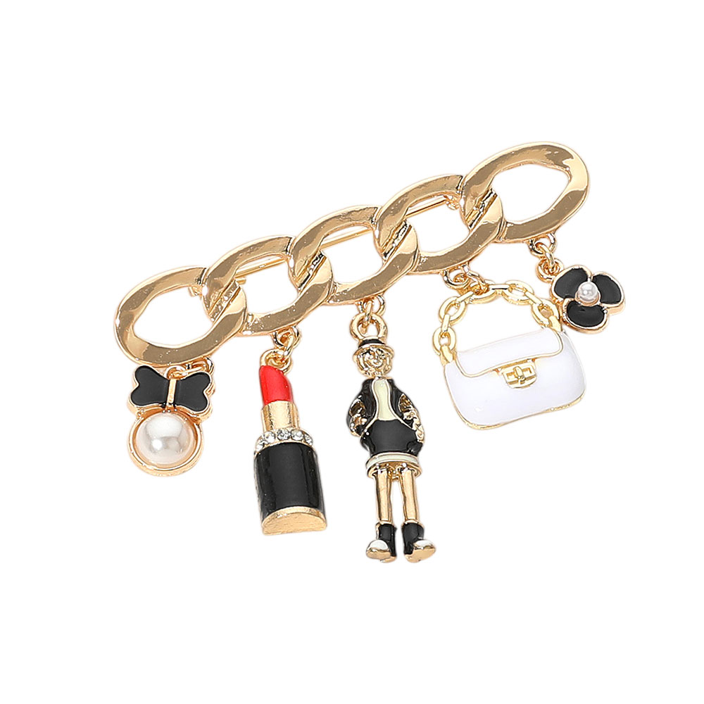 Details • Size : 2.4" X 1.9" • Pin Brooch • Showcase your unique style with this Fashion Charm Brooch featuring miniature lipstick, handbag, and pearl accents. Designed with a chic chain-link base, this playful yet elegant accessory adds a touch of glamour to jackets, bags, or scarves for a stylish finish.