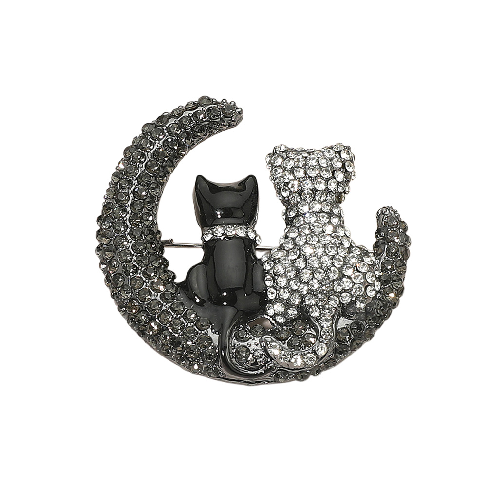 Details • Size : 1.75" X 1.75" • Pin Brooch • Charming cat and moon brooch adorned with dazzling crystals, featuring two cats sitting together on a crescent moon. A whimsical accessory that adds sparkle and personality to any outfit, perfect for animal lovers, collectors, or as a thoughtful gift with symbolic meaning. • Lead and Nickel Compliant • Sterling Silver Dipped