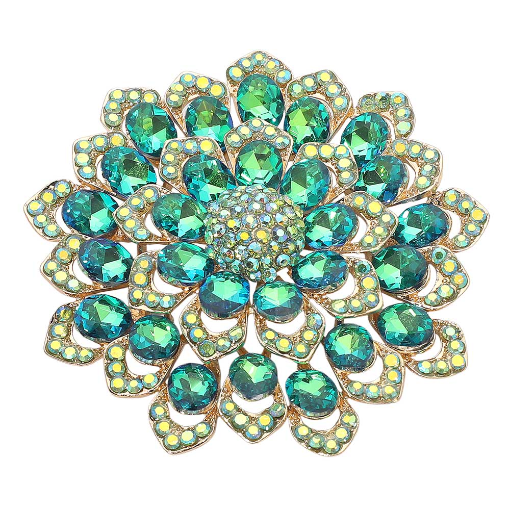 Details • Size : 3.1" X 3.1" • Pin Brooch • Stunning floral brooch designed with layered petals and iridescent crystal gemstones. Perfect as a statement accessory for dresses, scarves, shawls, or special occasions, adding sparkle and elegance to any outfit. • Lead and Nickel Compliant