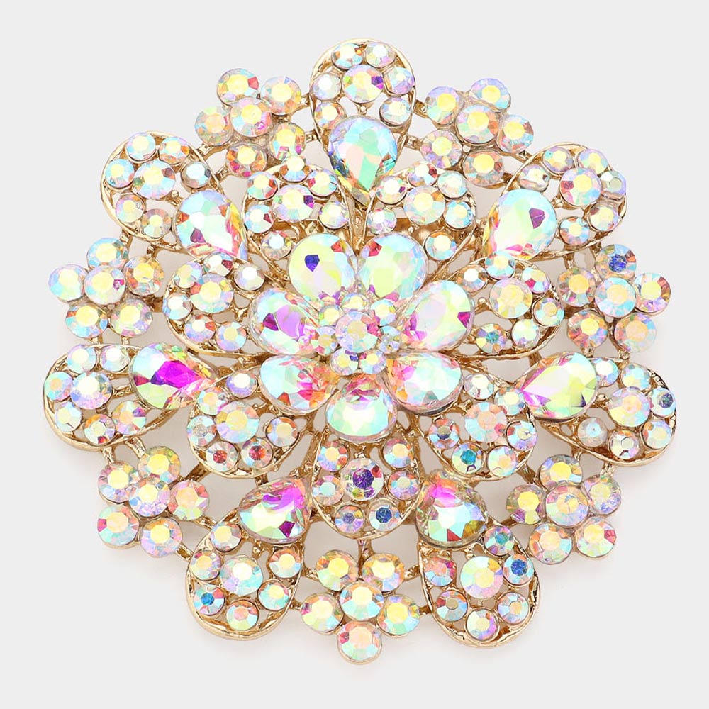 • Brilliant flower brooch adorned with iridescent crystals in layered petal design. A dazzling statement piece for dresses, scarves, or jackets, adding glamour and elegance to weddings, parties, or special occasions.
