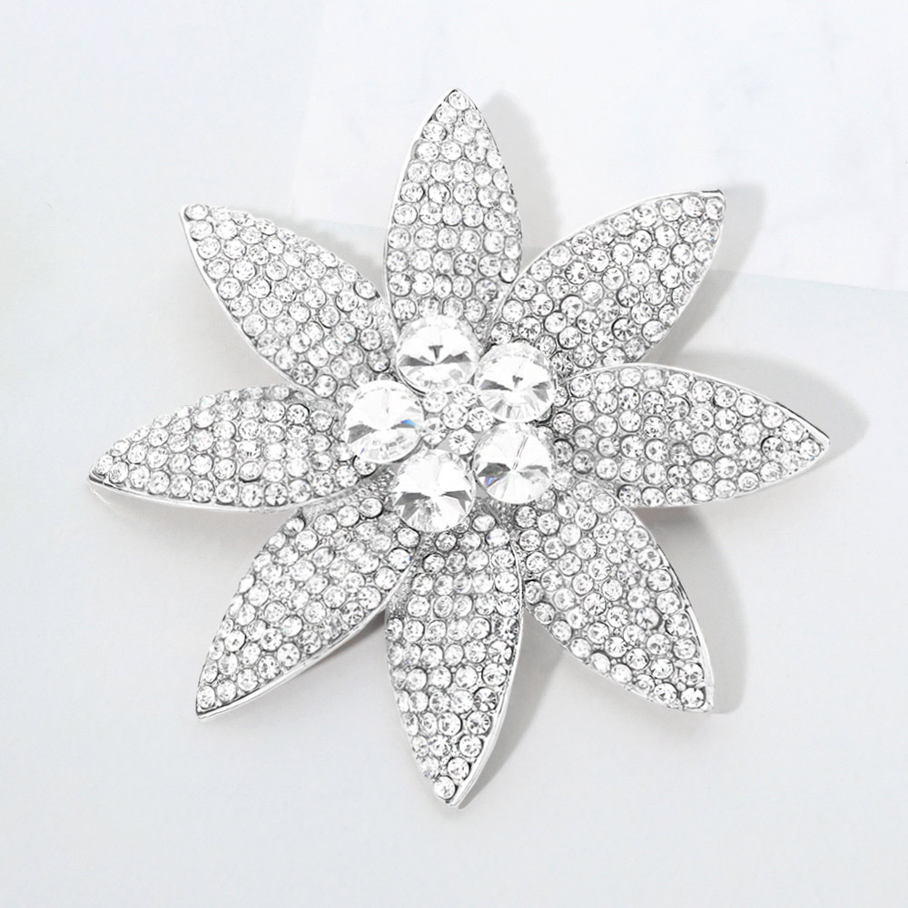 • Elegant floral brooch adorned with shimmering crystals arranged in a petal design. Perfect for adding a luxurious touch to coats, dresses, or scarves, this eye-catching accessory brings timeless glamour to any outfit.