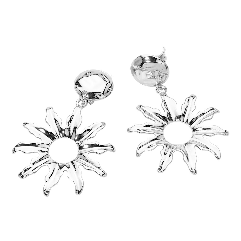 Details • Size : 2" X 2.8" • Clip On • Statement clip-on drop earrings featuring an abstract sunburst design with sculptural petal details. Lightweight and comfortable for non-pierced ears, these eye-catching earrings add artistic flair to everyday looks, resort wear, or special occasion styling. • Lead and Nickel Compliant