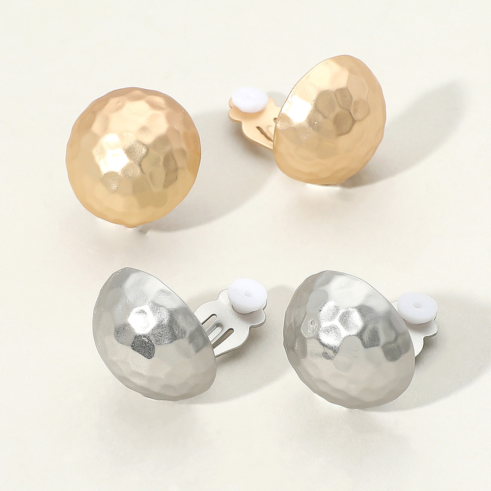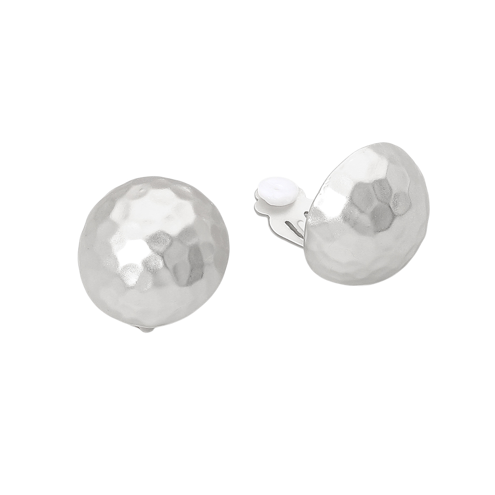 Details • Size : 0.9" X 0.9" • Clip On • Add a touch of modern texture with these hammered dome clip-on earrings. Featuring a bold rounded silhouette with a sleek reflective finish, they offer effortless elegance and comfort. Perfect for elevating both casual and formal outfits with understated sophistication. • Lead and Nickel Compliant