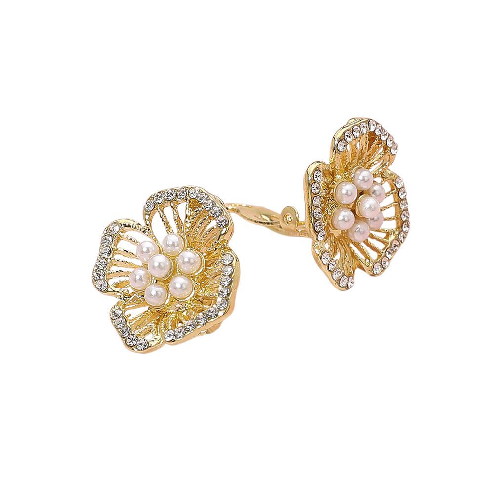 Details • Size : 0.8" X 0.9" • Clip On • Elevate your elegance with these open-petal clip-on earrings featuring a radiant pearl cluster center and sparkling crystal trim. Their airy floral design exudes sophistication and timeless beauty, offering a comfortable, pierced-free fit perfect for any formal or casual occasion. • Lead and Nickel Compliant