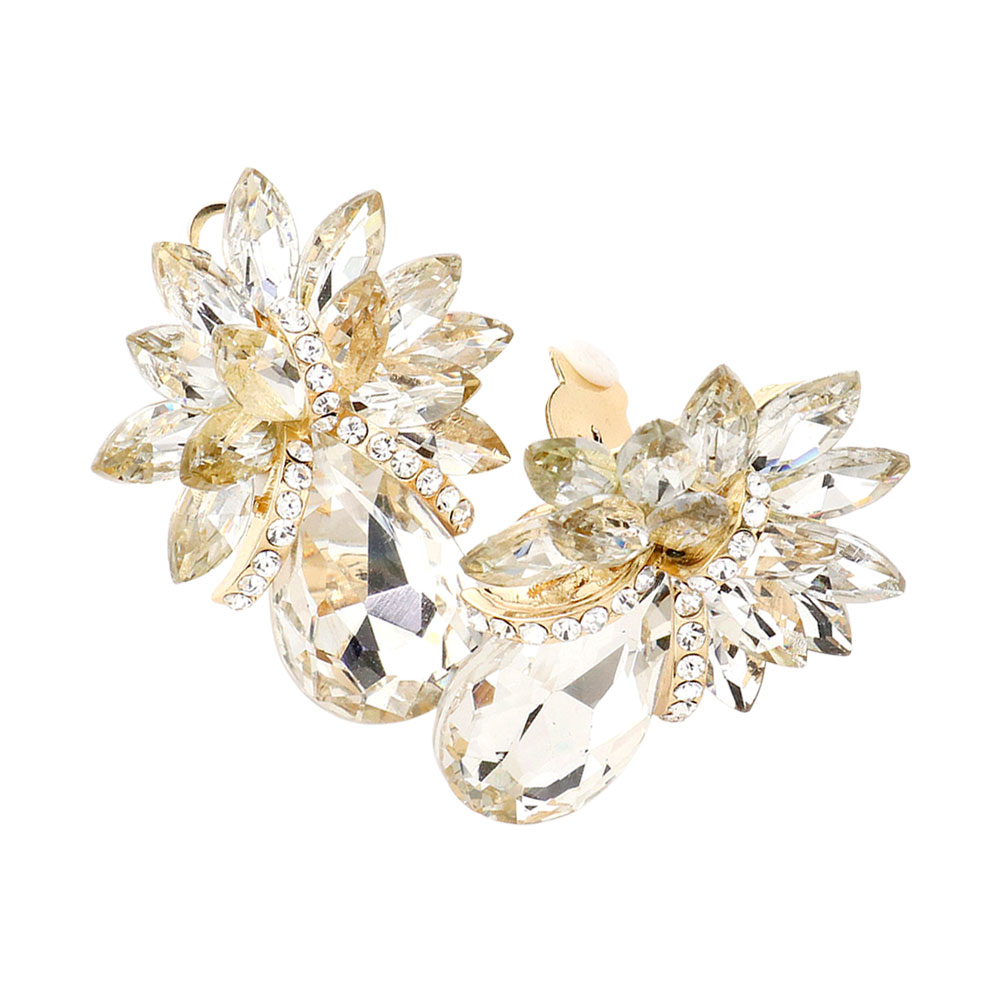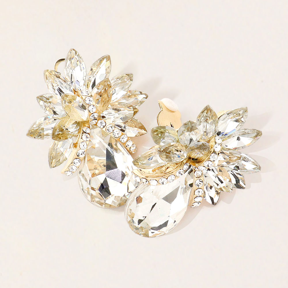 Details • Size : 1.75" X 2.25" • Clip On • Stunning clip-on earrings designed with a leaf cluster arrangement and dazzling crystal accents. These bold statement earrings add a glamorous touch to any outfit, perfect for parties, weddings, and evening events where timeless sophistication meets modern sparkle.