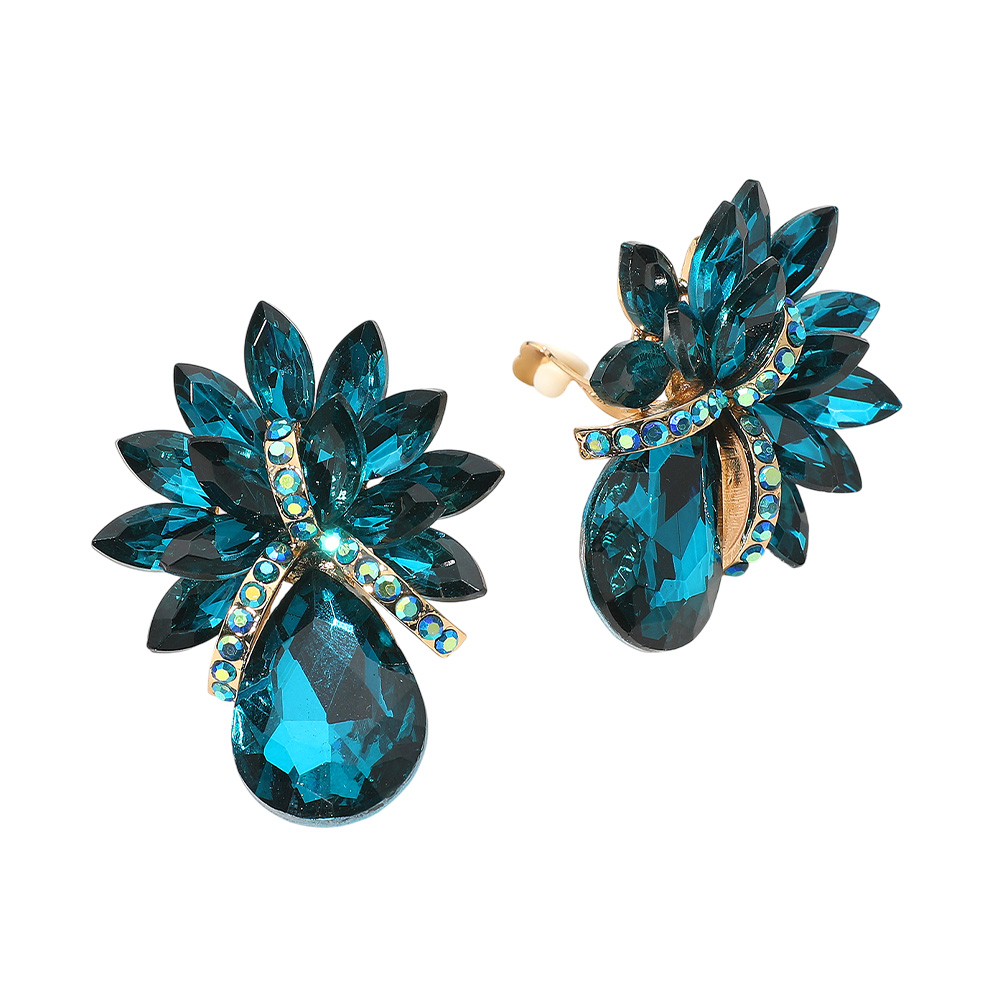 Details • Size : 1.75" X 2.25" • Clip On • Stunning clip-on earrings designed with a leaf cluster arrangement and dazzling crystal accents. These bold statement earrings add a glamorous touch to any outfit, perfect for parties, weddings, and evening events where timeless sophistication meets modern sparkle.