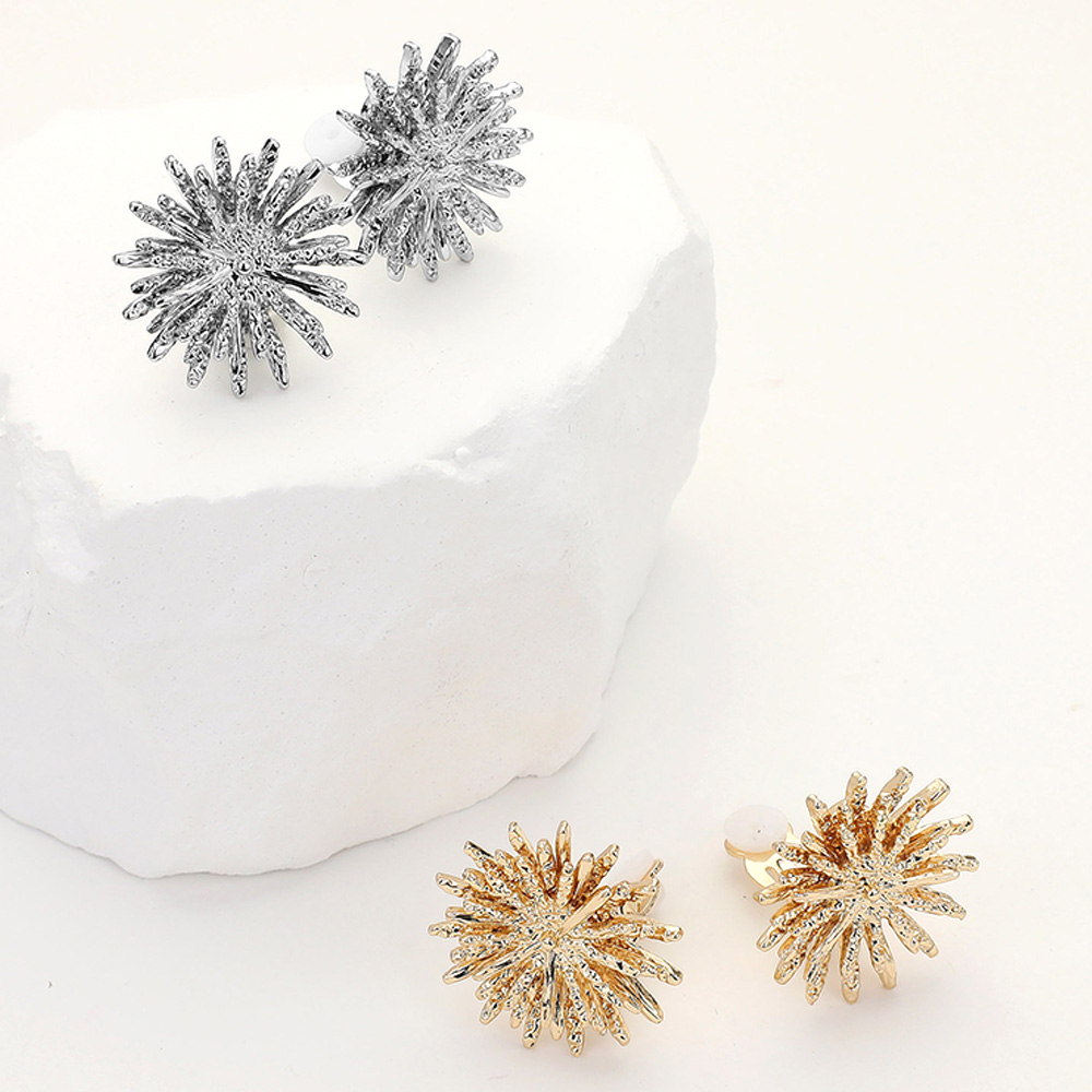Details • Size : 0.9" X 0.9" • Clip On • Add dazzling brilliance to your style with these radiant starburst clip-on earrings. Designed with intricate detailing for a bold yet elegant look, they capture light beautifully from every angle. Perfect for special occasions or adding sparkle to everyday wear—no piercings required. • Lead and Nickel Compliant