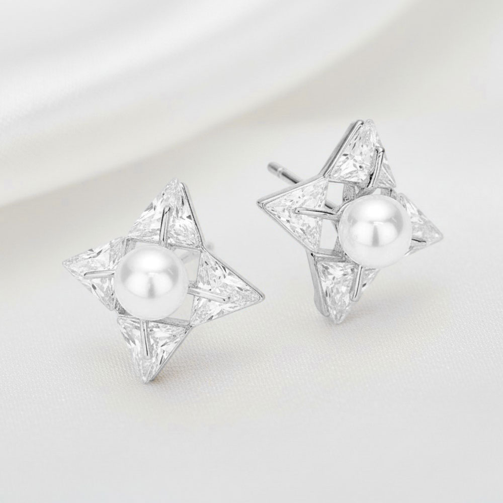 Pearl Centered Crystal CZ Stone Star Stud Earrings