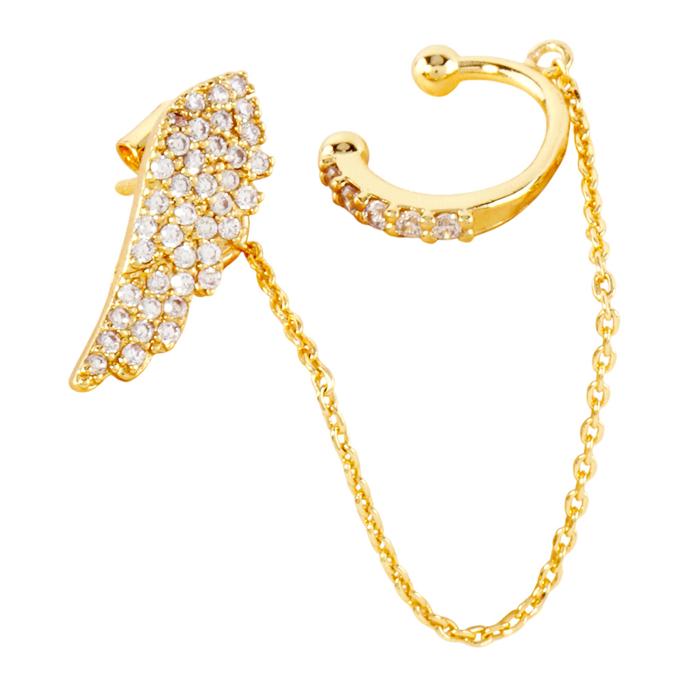 Details • Size : 0.8" X 2.2" • This gold-dipped chain earring features a stunning wing design adorned with sparkling cubic zirconia, linked elegantly to a matching ear cuff. Crafted with hypoallergenic sterling silver posts, it offers a perfect mix of glamor and comfort for modern, sophisticated styling. • CZ Cubic Zirconia • Gold Dipped • Hypoallergenic • Lead and Nickel Compliant • Made In Korea • Sterling Silver Post