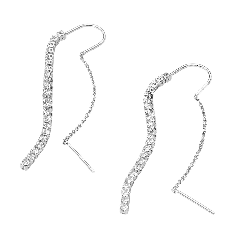 • Sleek threader earrings adorned with a shimmering row of crystals, designed to drape elegantly along the ear for a contemporary look. Lightweight and versatile, these sparkling drops add a refined touch to evening wear, work outfits, or chic casual style.
