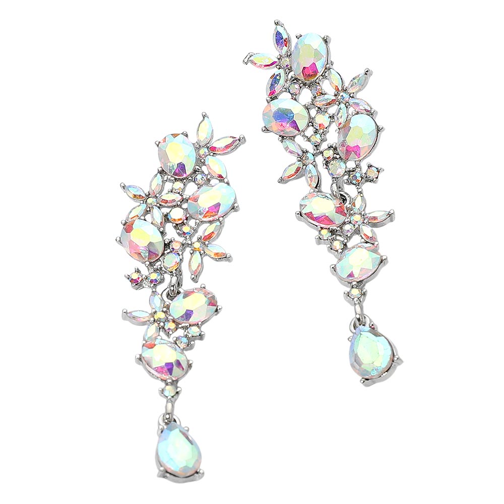 Details • Size : 0.8" X 2.7" • Post Back • These floral gem cluster drop earrings feature a graceful arrangement of marquise and oval-cut stones, creating a cascading botanical-inspired design. Perfect for evening wear or special occasions, they bring elegance and sparkle to any outfit with their intricate detailing and refined charm. • Lead and Nickel Compliant
