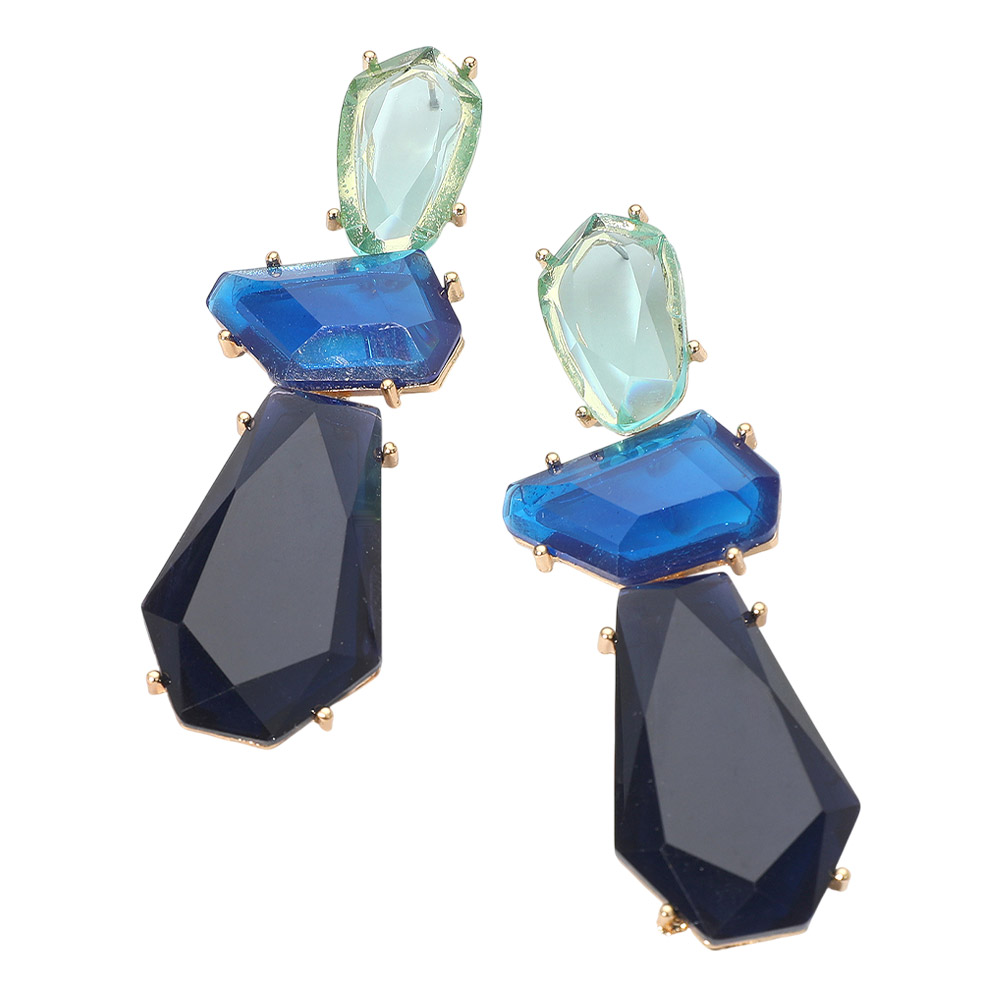 Details • Size : 1.25" X 3.25" • Post Back • Make a bold statement with these geometric three-stone drop earrings. Featuring an artful mix of faceted stones in a modern tiered design, they capture light beautifully for an effortlessly elegant look. Perfect for adding sophistication and drama to any outfit. • Lead and Nickel Compliant