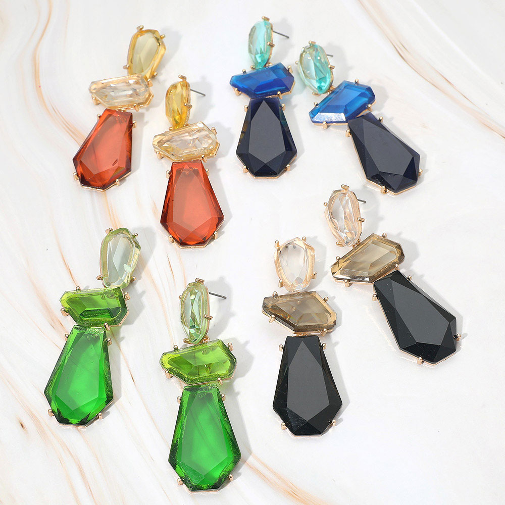 Details • Size : 1.25" X 3.25" • Post Back • Make a bold statement with these geometric three-stone drop earrings. Featuring an artful mix of faceted stones in a modern tiered design, they capture light beautifully for an effortlessly elegant look. Perfect for adding sophistication and drama to any outfit. • Lead and Nickel Compliant