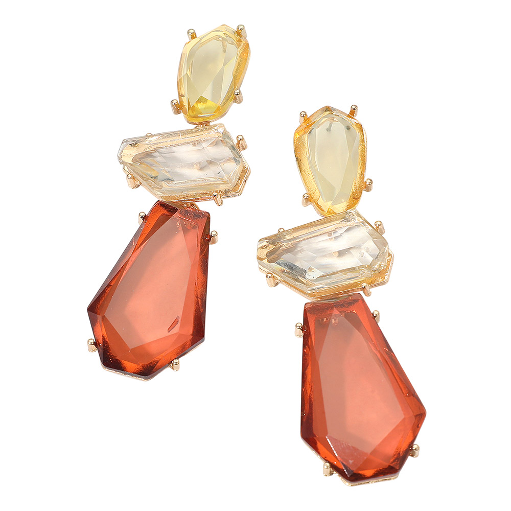• Make a bold statement with these geometric three-stone drop earrings. Featuring an artful mix of faceted stones in a modern tiered design, they capture light beautifully for an effortlessly elegant look. Perfect for adding sophistication and drama to any outfit.